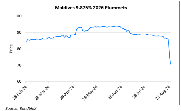 Maldives’ 9.875% 2026s bond has dropped by 15-16 points over the week and currently trades at 70.7