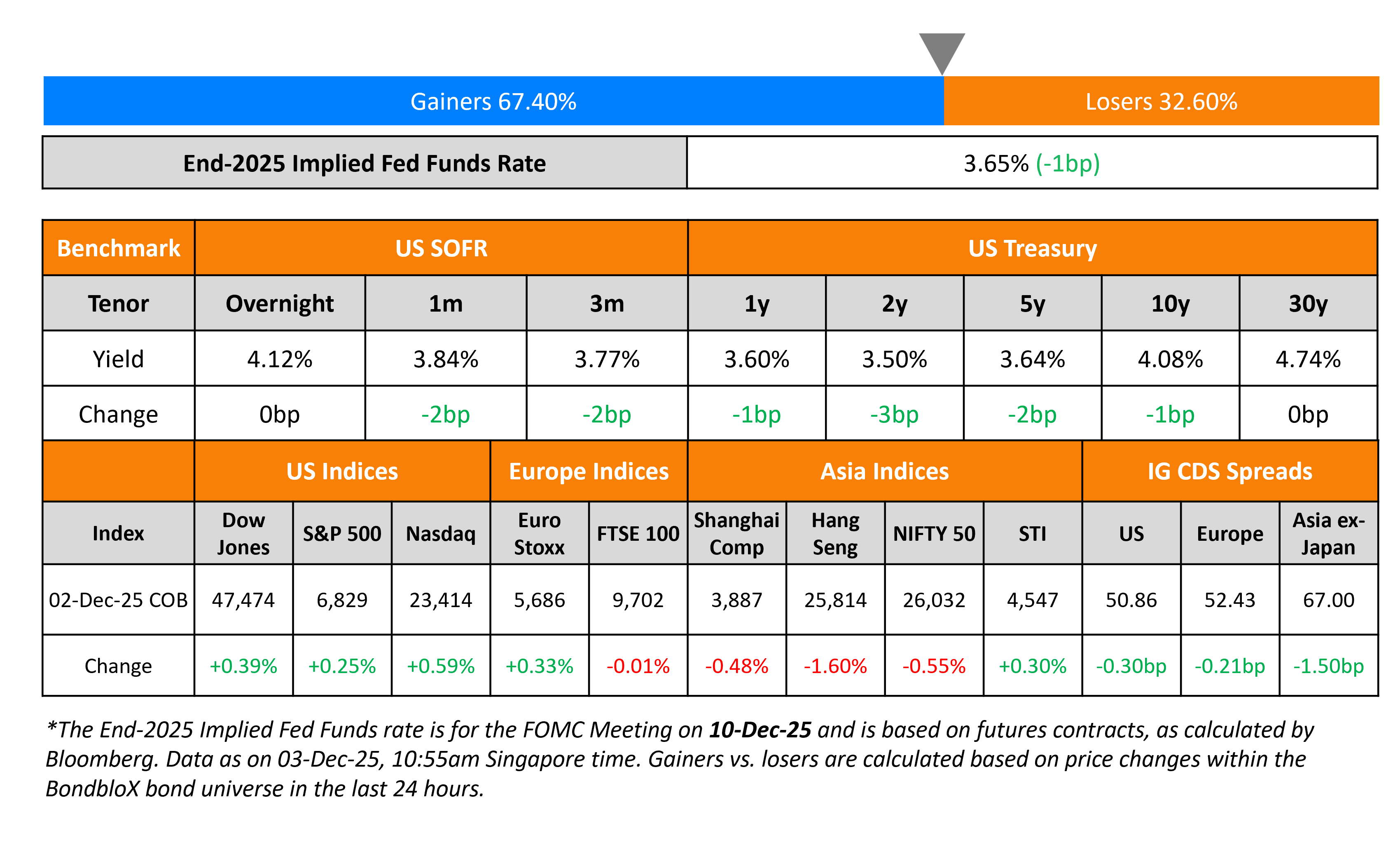 US Treasury yields eased by 1-3bp yesterday. There were no major data points released yesterday and markets are currently pricing in an 89% probability of a 25bp rate cut at the FOMC meeting next week. While Treasuries are set for their best year since 2020 with the Bloomberg US Treasury Index up 6.23% YTD, JPM strategists are not hopeful of the strong performance continuing into 2026. “If the Fed doesn’t deliver as many cuts, there’s some normalization” in Treasury yields, said Jay Barry, JPMorgan’s head of global rates strategy.