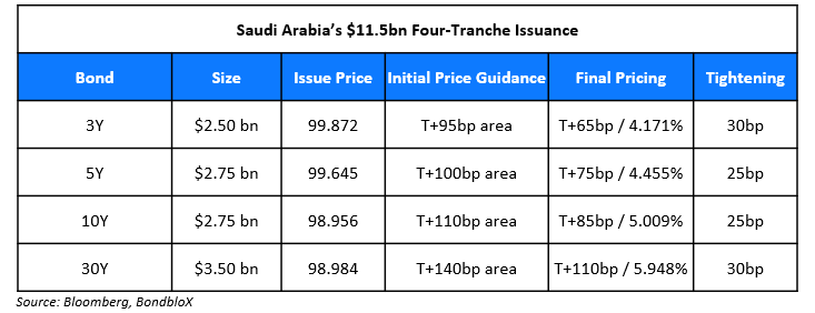 Saudi Arabia raised $11.5bn via a four-trancher.