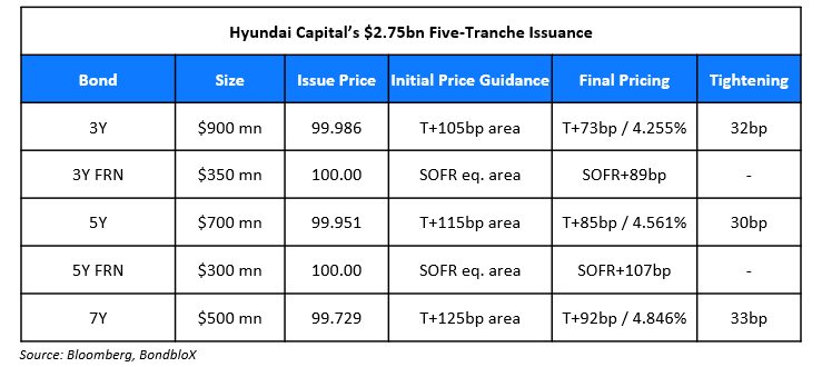 Hyundai Capital raised $2.75bn via a five-trancher.