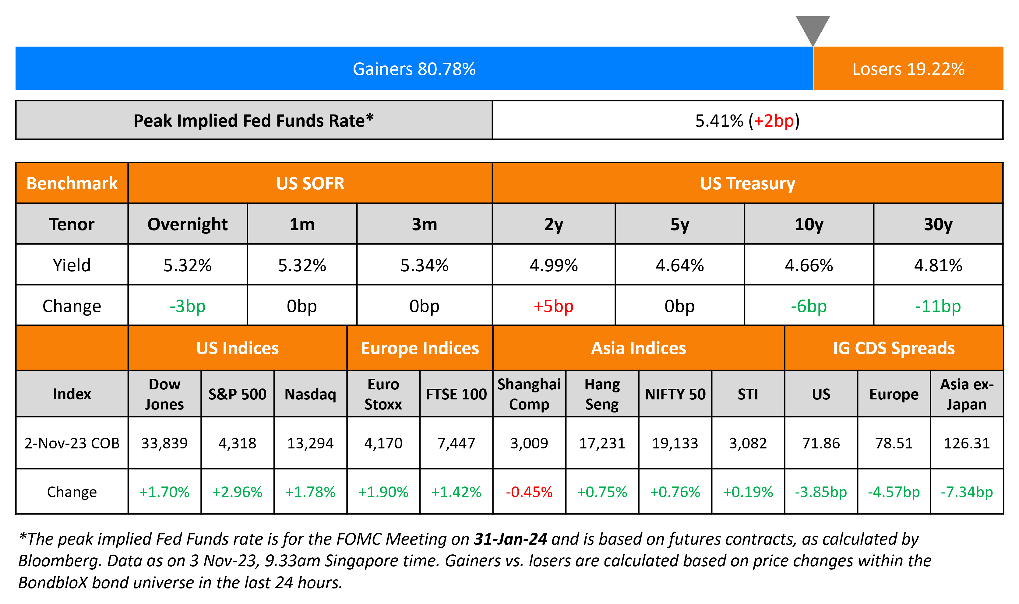 US Treasuries were mixed, with the 2Y yield up 5bp to 4.99% while the 10Y yield fell another 6bp, with the latter continuing its move lower since Wednesday. US initial jobless claims rose for a sixth straight week to 217k, higher than estimates of 210k. Analysts note that the recent trend may indicate trouble finding new jobs for those that have recently lost theirs. Later today, markets await the non farm payrolls (NFP) print with expectations of a 180k print. Average Hourly Earnings (AHE) YoY is expected to rise by 4%. Also, the ISM Non-Manufacturing print is expected to come in at 53. US credit markets continued to tighten – IG CDS spreads tightened 3.9bp and HY spreads tighten by 22.7bp. S&P and Nasdaq rose 1.8-1.9%.