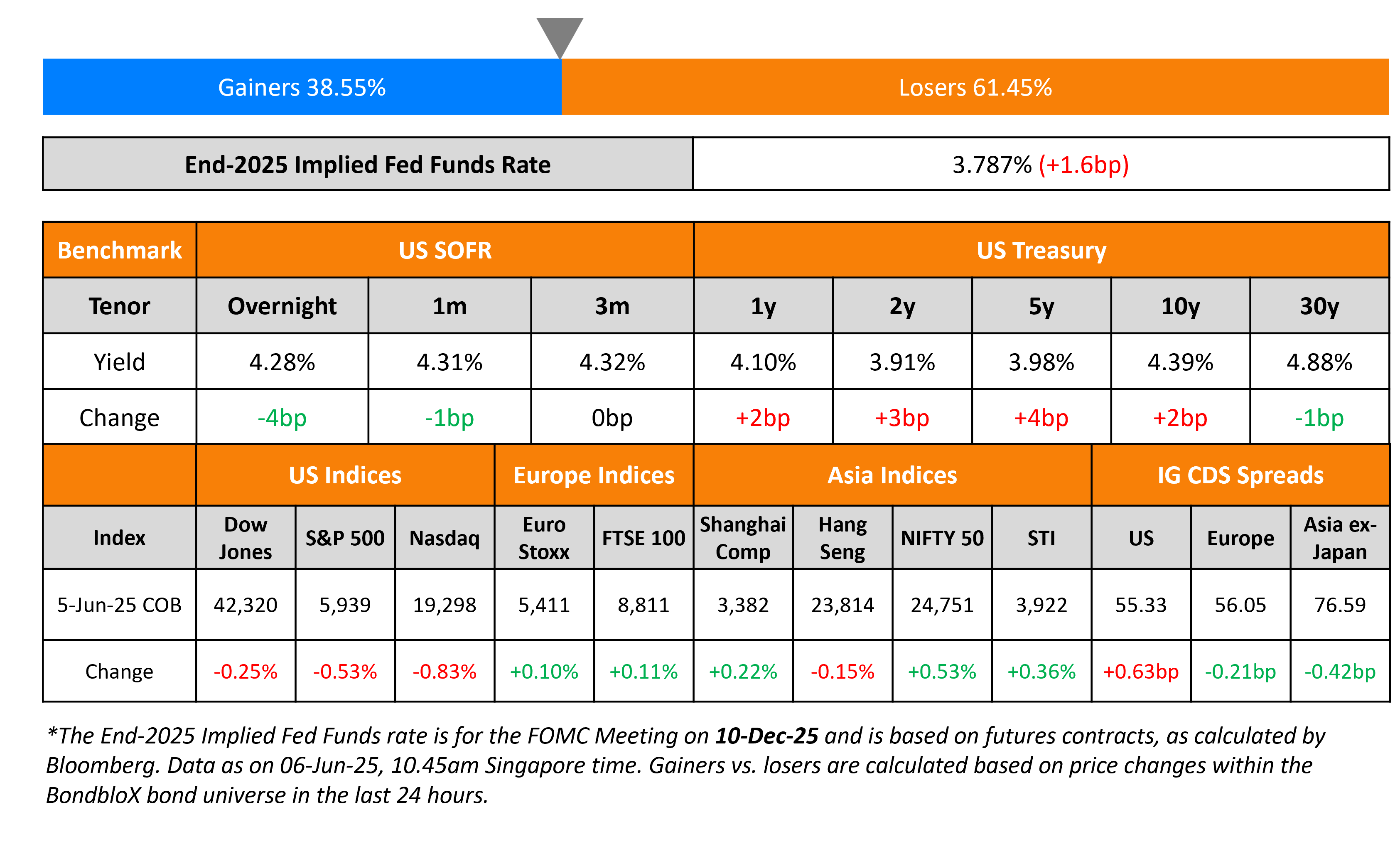 US Treasury yields rose by 2-4bp yesterday. Initial jobless claims for the prior week worsened by 247K, vs. expectations of 235K, marking its worst reading since October 2024. Markets await the NFP report later today, with economists expecting a 126K pickup, and the unemployment rate to hold steady at 4.2%. US President Donald Trump and Chinese President Xi Jinping held a 90-minute phone call and agreed to resume trade negotiations and plan a bilateral meeting. Kansas City Fed President Jeff Schmid warned that new tariffs could reignite inflation, with upward price pressures likely to emerge in the coming months. Federal Reserve Governor Adriana Kugler emphasized that inflation poses a greater risk than weakening employment, citing pressure from Trump’s tariff policies.