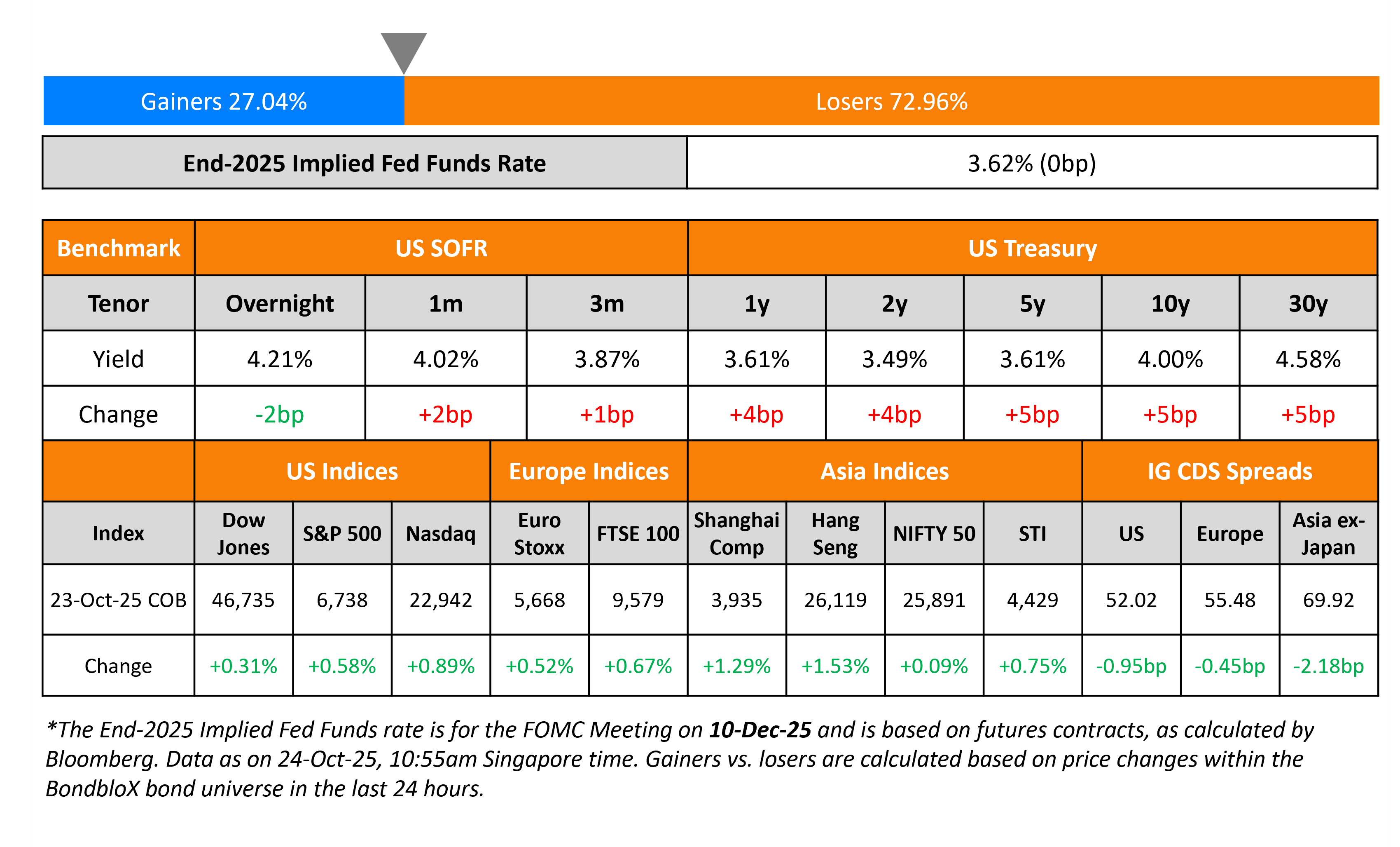 Looking at equity markets, the S&P and Nasdaq closed 0.6% and 0.9% higher. The US IG and HY CDS spreads tightened by 1bp and 5.2bp respectively. European equity indices ended higher too. The iTraxx Main and Crossover CDS spreads were 0.5bp and 1.3bp tighter respectively. Asian equity markets have opened in the green today. Asia ex-Japan CDS spreads were 2.2bp tighter.