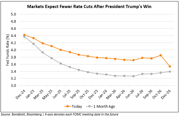 The US 2Y Treasury yield rose by 4bp while the 10Y yield fell by 3bp and the curve flattened. Minneapolis Fed President Neel Kashkari spoke on Sunday, remarking that while the economy was strong, inflation continued to remain a challenge. Analysts noted that while the Fed is expected to cut rates at their December meeting, it is likely that the policymakers will reduce rates by less than previously expected in the coming months, following Donald Trump’s election victory. This can also be observed in the market expectations of the Fed Funds rate, based on the pricing of Fed Funds Futures, as seen in the chart above. For instance, the end-2025 Fed Funds Rate expectation is currently at 3.79%, about 45bp higher than the 3.34% seen a month ago. Later in the week, several other Fed Presidents are scheduled to speak at various events, and the CPI data for the month of October will be released this Wednesday. US IG CDS spreads tightened by 0.8bp while HY CDS spreads were flat. Looking at US equity markets, S&P and Nasdaq both closed higher last Friday by 0.4% and 0.1% respectively.