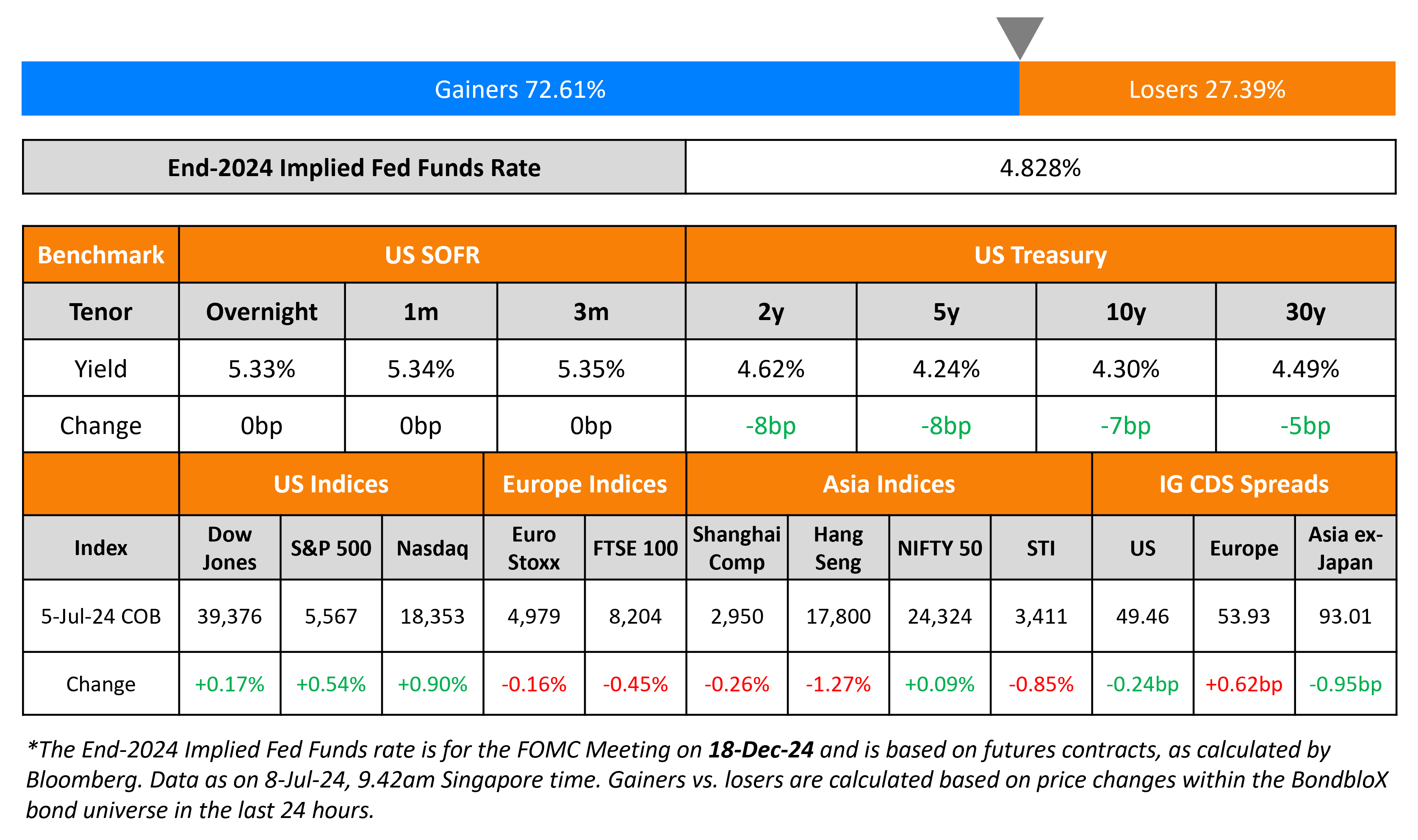 US Treasury yields dropped by 7-8bp across the curve following a soft employment report on Friday. US Non-Farm Payrolls (NFP) for June rose by 206k, higher than expectations of 190k, while May’s print was revised down to 218k from 272k. The Unemployment Rate was higher at 4.1% vs. expectations of 4.0%. Average Hourly Earnings (AHE) YoY was in-line with expectations at 3.9%, but also showing a decrease from 4.1% seen in May. Markets are currently fully pricing-in a 50bp rate cut by the Fed by end-2024, going by the Implied Fed Funds Rate as of the December FOMC meeting at 4.828%. Separately, New York Fed President John Williams said that the Fed is still “a way” from reaching their inflation goal. Looking at equity markets, S&P and Nasdaq were up 0.5% and 0.9%, respectively. US IG spreads were 0.2bp tighter and while HY CDS spreads widened by 0.5bp.