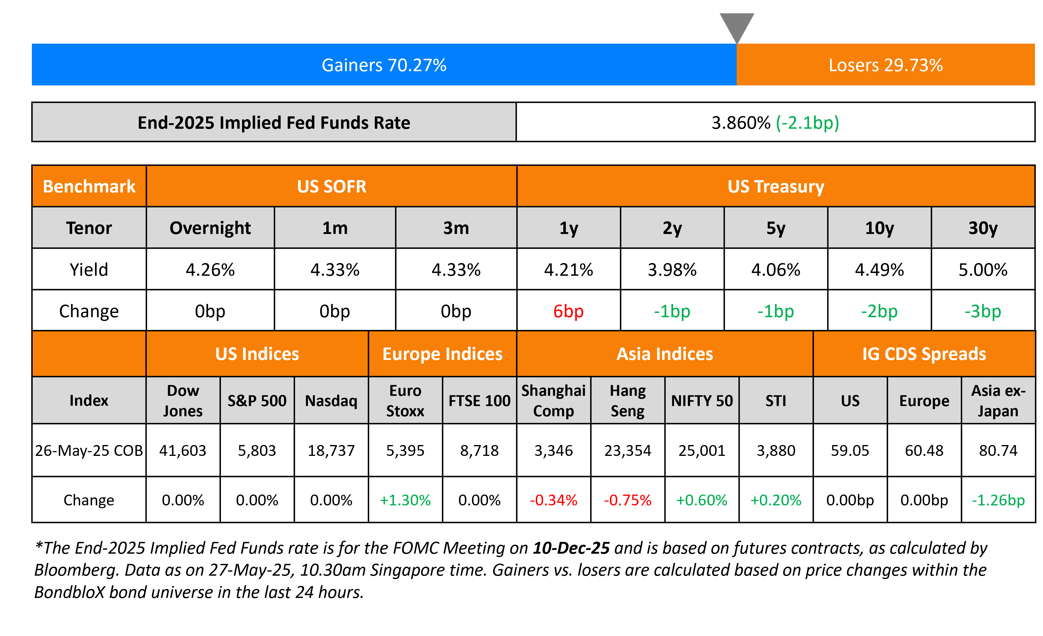 US equity and credit markets were closed yesterday on account of Memorial Day. Similarly, European credit markets were also closed due to the Spring Bank holiday. Asian equity markets have opened lower today. Asia ex-Japan IG CDS spreads tightened by 1.3bp.