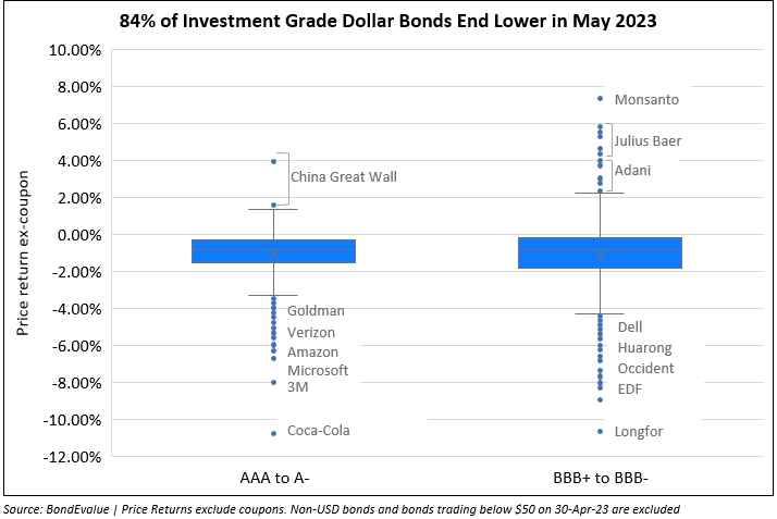 The month of May saw a reversal in fortunes for bond markets after a cheerful first quarter and its extended run in April. 79% of dollar bonds in our universe ended May in the red (ex-coupon) as compared to 81% that ended April in the green. Of this, Investment Grade (IG) bonds underperformed High Yield (HY) as seen in the table below with 84% of bonds ending lower in the former and 66% in the latter. The underperformance in IG-rated bonds primarily comes on the back of its duration sensitivity following the massive sell-off in US Treasuries over the course of the month.