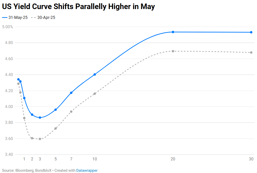 The month of May saw the Treasury yield curve shift further higher from April, with a parallel upward move of ~25bp across the curve. The move started with the strong Non-Farm Payrolls (NFP) print that saw a pick-up of 177k jobs, higher than the surveyed 138k. The Unemployment Rate held steady at 4.2%. US inflation continued to ease slightly, with April CPI up 2.3% YoY, softer than the expected 2.4%. Core CPI came at 2.8%, in-line with expectations. Meanwhile, both manufacturing and services sector activity continued to improve. Following the continued upbeat data and relaxation in tariff policy, FOMC members hinted at a delay in rate cuts, and the need to wait for the impact of the US administration’s policies.