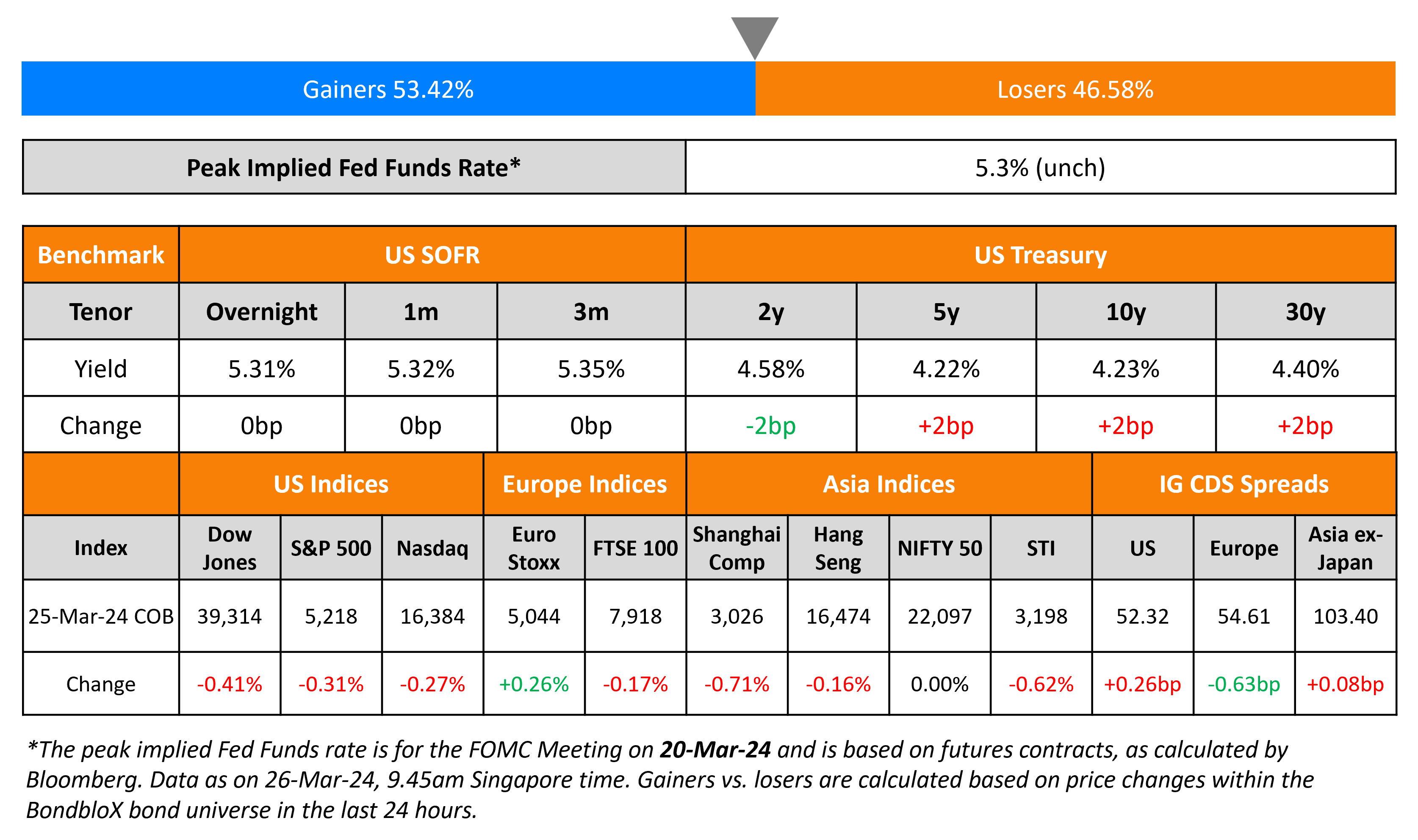 European equity indices closed mixed. European IG CDS spreads tightened 0.6bp and HY spreads were 4.9bp tighter. Asian equity markets have opened weaker today. Asia ex-Japan IG CDS spreads were 2.4bp wider. Singapore’s February core inflation accelerated to its fastest pace in seven months, coming in at 3.6% in February from a year earlier. This was also higher than the 3.1% seen in January, and Bloomberg’s estimates of 3.4%. This was driven by higher services and food inflation, partly reflecting seasonal effects associated with the Lunar New Year.