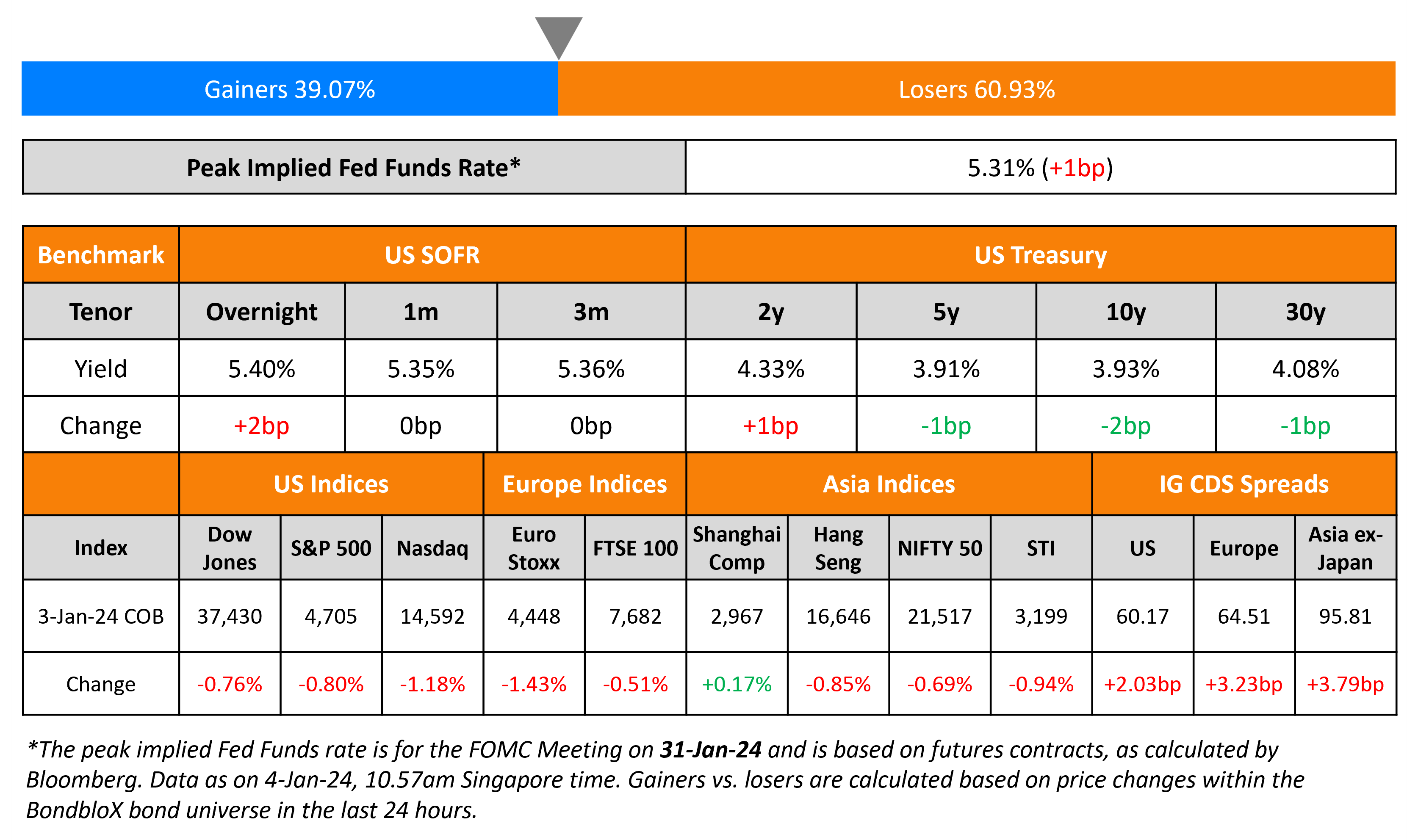US Treasury yields eased slightly yesterday by 1-2bp. Primary markets continued to showcase a strong start to the new year with another flurry of new issuances yesterday. On the data front, the US ISM Manufacturing Index edged up 0.7 points to 47.4 last month, albeit extending the longest stretch of contracting activity since 2000-01, following the dot-com bubble induced recession. As part of its components, the Prices Paid Index decreased by 4.7 points to 45.2, helped by a drop in oil prices to a near six-month low in December. Also, the FOMC minutes were released yesterday, citing lower inflation risks whilst also mentioning concerns about overly restrictive policy. US credit markets saw IG CDS spreads widen by 2bp and HY spreads widen by 12bp. US equity markets ended lower again, with the S&P falling 0.8% and Nasdaq falling 1.2%.