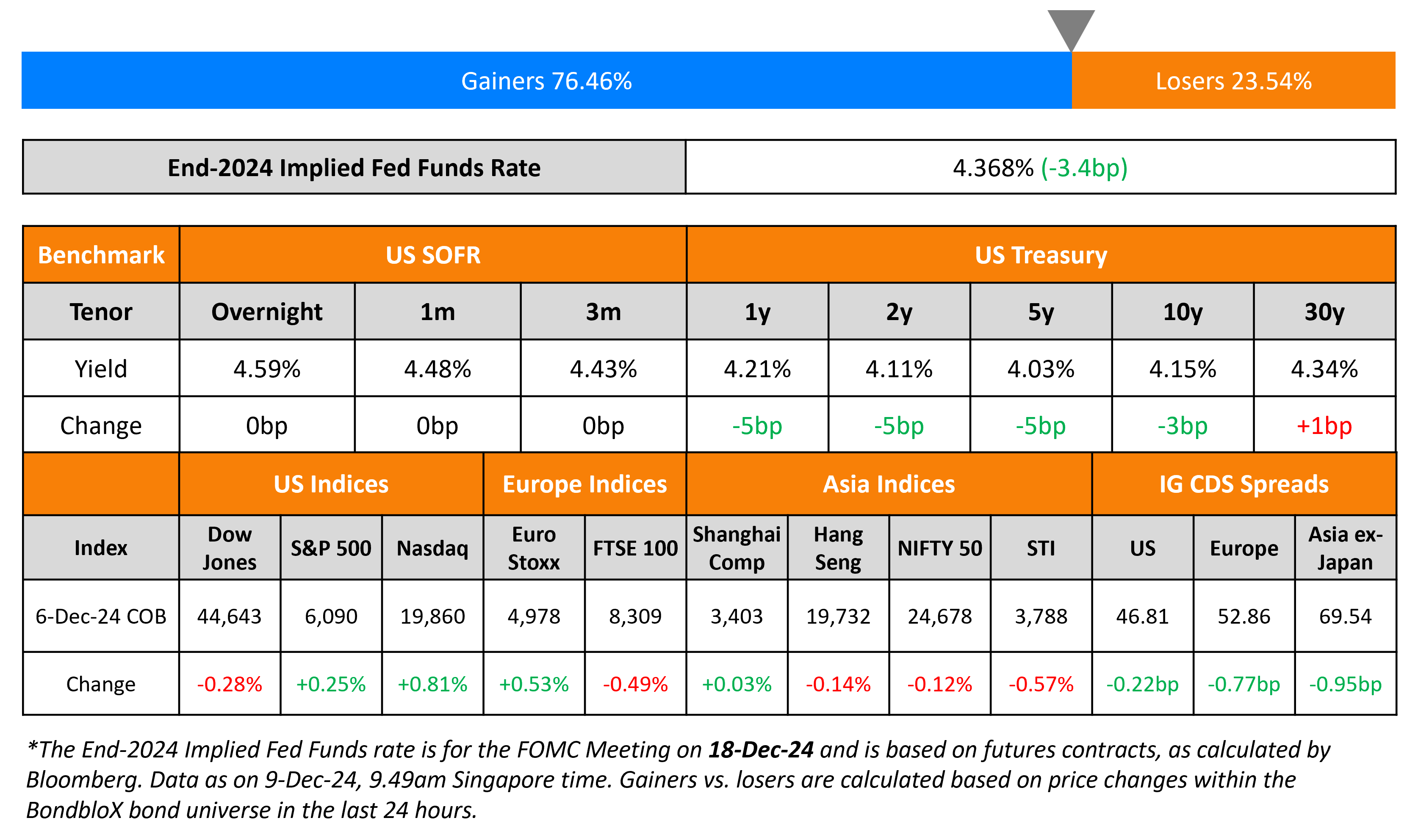 US Treasury yields eased by 3-5bp across the curve on Friday. US NFP rose by 227k, higher than expectations of 220k, with the unemployment rate at 4.2%, also higher than the expected 4.1%. Average hourly earnings YoY rose by 4.0%, higher than expectations of 3.9%, and unchanged from the prior month. At present, markets are pricing-in a 85% probability of a 25bp rate cut by the Fed in December.