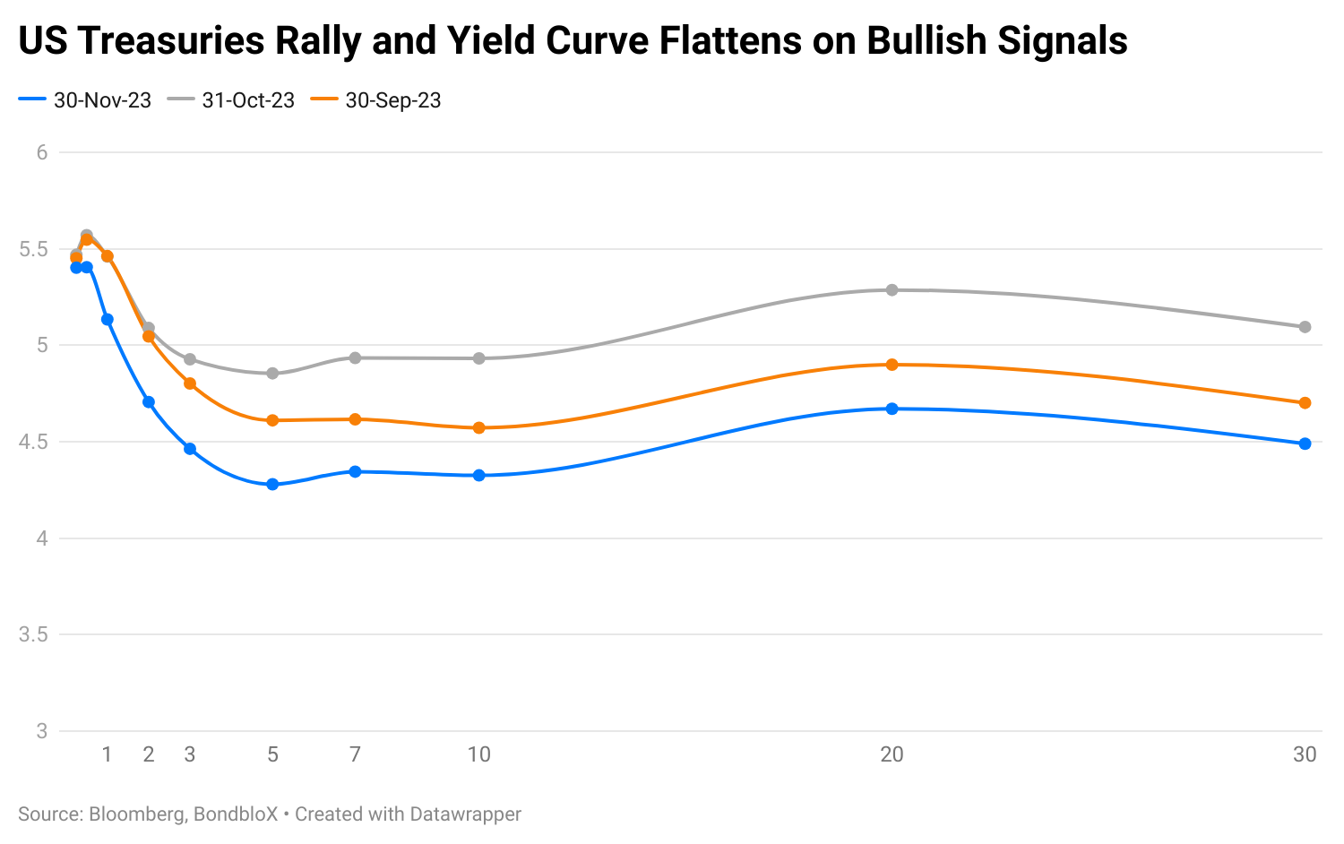 November saw a massive rally in Treasuries as yields significantly came off their highs and the curve flattened. The 2Y yield fell 38bp to 4.71% and the 10Y yield fell 61bp to 4.33% during the month. The 2s10s curve bull flattened by 22bp during the month to -38bp currently. While the US economy continued to show resilience, the broad softening trend in inflation and initial signs of weaker data saw FOMC members indicate the possibility of either a pause or the end of rate hikes. US Headline CPI for October 2023 rose by 3.2%, lower than expectations of 3.3% and the previous month’s 3.7%. Core CPI came at 4.0%, lower than expectations and the previous month's 4.1% print. Markets priced out any further hikes by the Fed and many analysts expect the Fed to cut rates in the second half of 2024. Besides, the ISM Manufacturing Index fell 2.3 points in October, the biggest monthly decrease in over a year, to 46.7. Similarly, NFP for October rose by 150k, lower than the surveyed 180k and last month's 336k. Moreover, the US Treasury surprised markets with a slowdown in the pace of increases in its quarterly debt issuances. Owing to all of the above coupled with market sentiment, Treasury yields dropped and corporate bonds across the spectrum witnessed a rally.