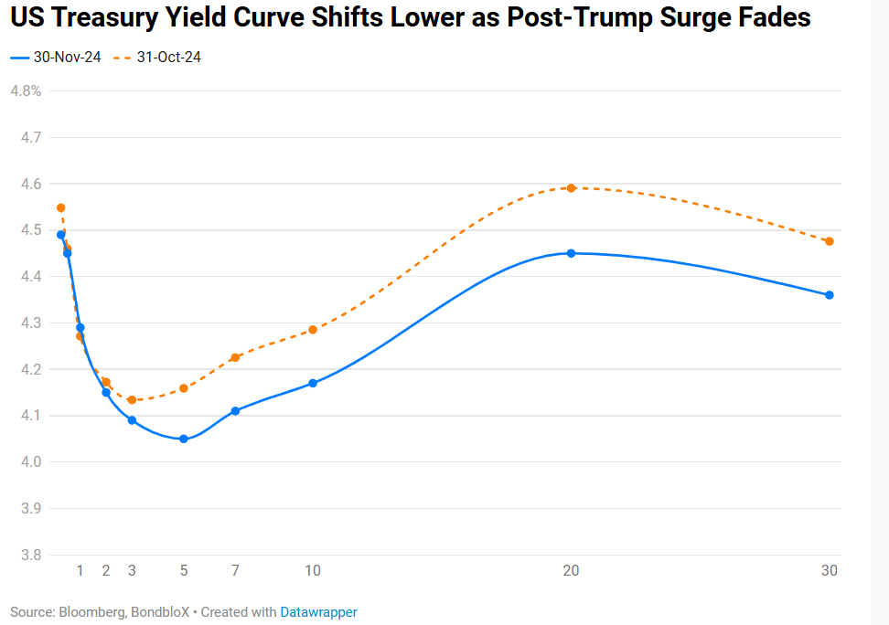 November saw the Treasury yield curve shift lower, falling by ~10bp across the mid and long-end while short-end yields were stable. Treasury yields surged higher following Donald Trump's election victory, but eased later through the month. Economic data was mixed, US Non Farm Payrolls (NFP) for October saw only 12k job additions as compared to expectations of 100k, mainly due to one-off factors such as the hurricanes that occurred and the major Boeing labor strike that took place. AHE YoY rose by 4.0%, and the Unemployment Rate stood at 4.1%, both inline with expectations. Looking at inflation, US Headline and Core CPI rose as expected, by 2.6% and 3.3% YoY respectively. Meanwhile, manufacturing activity continued to contract, with the ISM Manufacturing Index coming at 46.5, while the Services PMI stayed upbeat at 56.0. Fed's Jerome Powell and Adriana Kugler remarked that the Fed must proceed with caution with respect to rate cuts and not rush them. Following this, markets priced-in only a 51% chance of a 25bp December Fed rate cut. However, other Fed speakers including Neel Kashkari and Austan Goolsbee later voiced their justification for a potential rate cut in December, for which markets are now pricing-in a 67% possibility and Treasury yields moving lower since then.