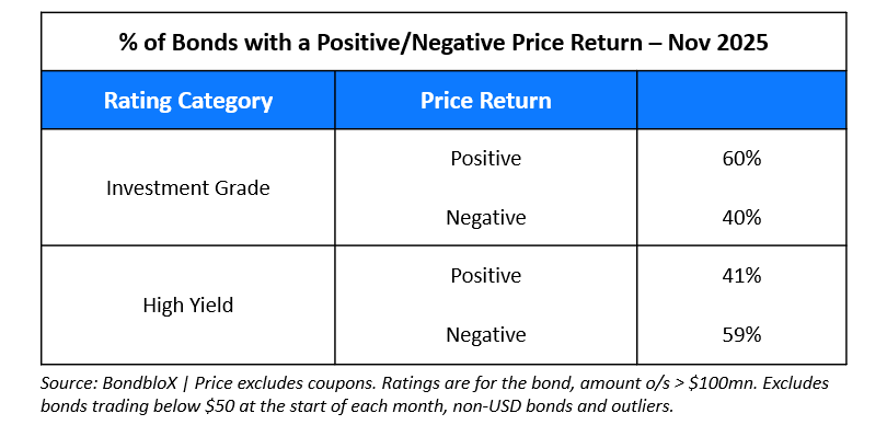 November 2025 was a modest month for bond investors, with 55% of dollar bonds ending higher (price returns ex-coupons). 60% of Investment Grade (IG) bonds ended in the green, outperforming High Yield (HY) bonds where 59% ended in the red. US Treasury yields ticked higher during the beginning of the month as markets began to price out the possibility of a December Fed rate cut. However, yields quickly came down after dovish comments by Fed speakers led by John Wiiliams in late-November. This saw markets reprice the December rate cut, with the probability of a cut at nearly 90% currently.