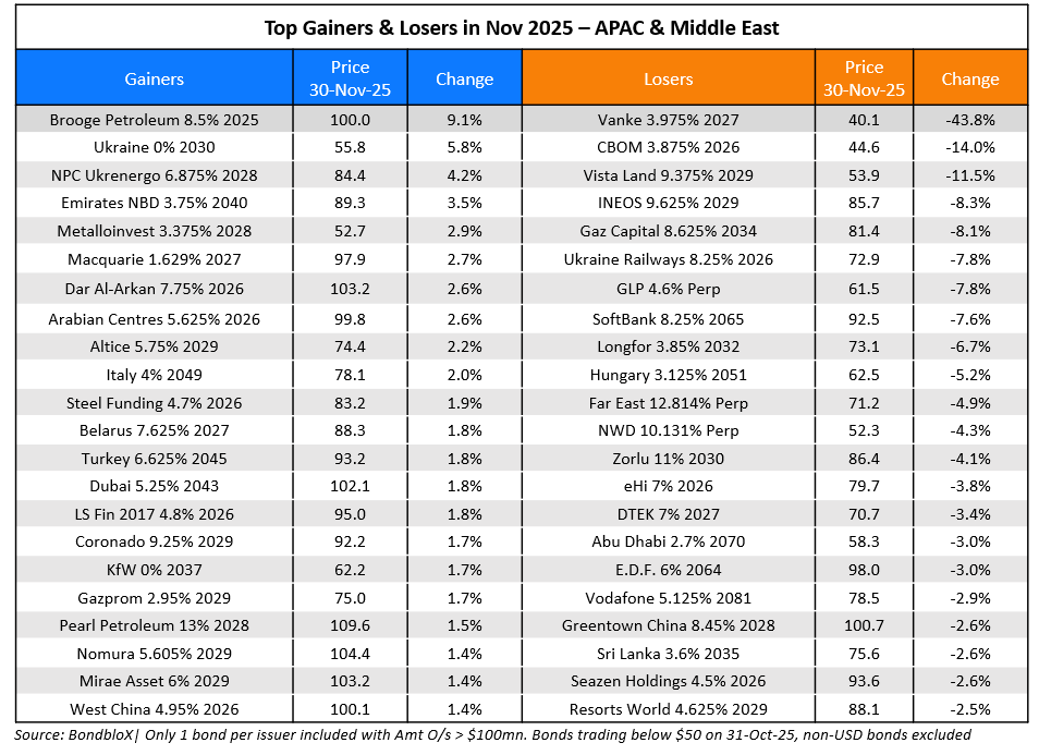 In the AAA to A- rated IG space, ultra long-dated bonds (maturing beyond 2060) of top tech companies like Amazon, Meta and Apple ticked lower by 2-3%. In the BBB+ to BBB- space, Oracle’s longer-dated notes in particular, were the most prominent losers, down by 3-5%. This came on the back of the jump in its CDS spreads to its highest level in 3 years, on the back of concerns over the company’s AI-based spending and potential overvaluation.