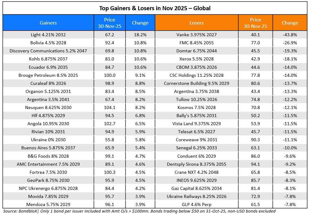 Among the losers, Vanke’s dollar bonds lost almost 40% of their value after the company sought extension of local bond payments due in December. This impacted bonds of other real estate companies like Longfor and Seazen, whose bonds saw a drop of over 4%. FMC’s dollar bonds were the second worst performer, dropping by 20-27%, due to weak Q3 results, and its subsequent downgrade to HY status of BB+ by S&P. Domtar’s bonds dropped by 16-19% in the HY space, followed by CSC Holdings’ dollar bonds which dropped by 7-14% across the curve. Senegal’s dollar bonds dropped by 7-10% during the month after it could not secure a funding program deal with the IMF.