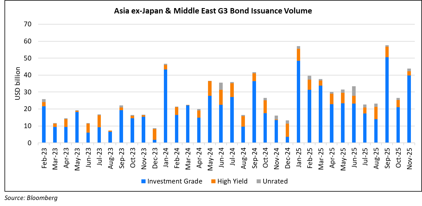 Asia ex-Japan & Middle East G3 issuance stood at $45bn, up 25% MoM and more than doubled YoY. 89% of the volumes came from IG issuers with HY issuing 9% and unrated issuers taking the rest.