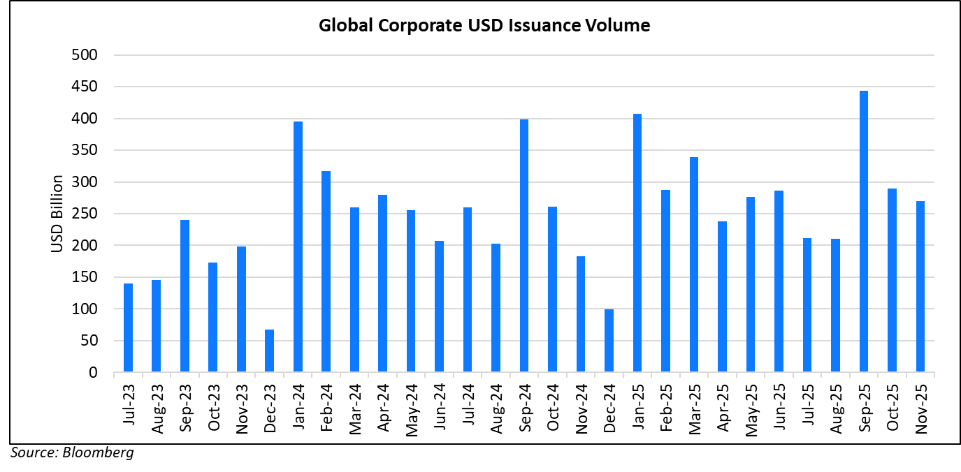 Global corporate dollar bond issuances stood at $270bn in November, 7% lower MoM. As compared to November 2024, issuance volumes were up 47%. 78% of the issuance volumes came from IG issuers with HY comprising 20% and unrated issuers taking the remaining 2%.