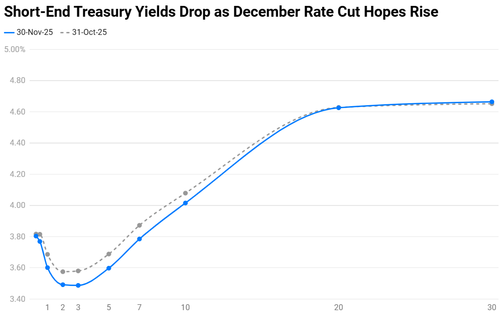 The month of November saw the Treasury yield curve shift lower, led by the near-term yields – the 1Y, 2Y and 3Y yield fell by 9bp while the 10Y ended 5bp lower. The delayed US Non-Farm Payrolls (NFP) reading for September came-in at 119k, better than expectations of 53k. The Unemployment Rate rose to 4.4% from 4.3%, alongside an increase in labour force participation. The ISM Manufacturing Index fell to 48.7, worse than expectations, marking its eighth consecutive reading in contractionary territory. However, the ISM Services reading came in at 52.4, much better than expectations of 50.8 and the prior reading of just 50.0. The headline and core CPI readings did not get published due to the government shutdown at the time. With the government reopening mid-month and the broad data indicating a modest state of the economy, New York Fed President John Williams reignited rate cut chances. He said that there was room to lower rates again in the near-term as the labor market softens. Besides, other known doves including Christopher Waller, Stephen Miran and Michelle Bowman echoed a similar stance. Following this, markets are now pricing-in an 88% chance of a 25bp rate cut in December as compared to 44% a couple of weeks ago.