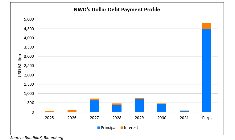 In the chart above, we have provided a summary of NWD’s outstanding principal and interest payments due on dollar denominated debt.