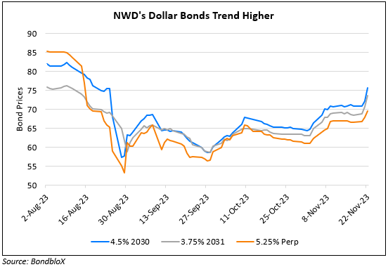 NWD’s dollar bonds were trading weaker with its 6.15% Perp down 0.2 points to 97.9, yielding 10.2%.