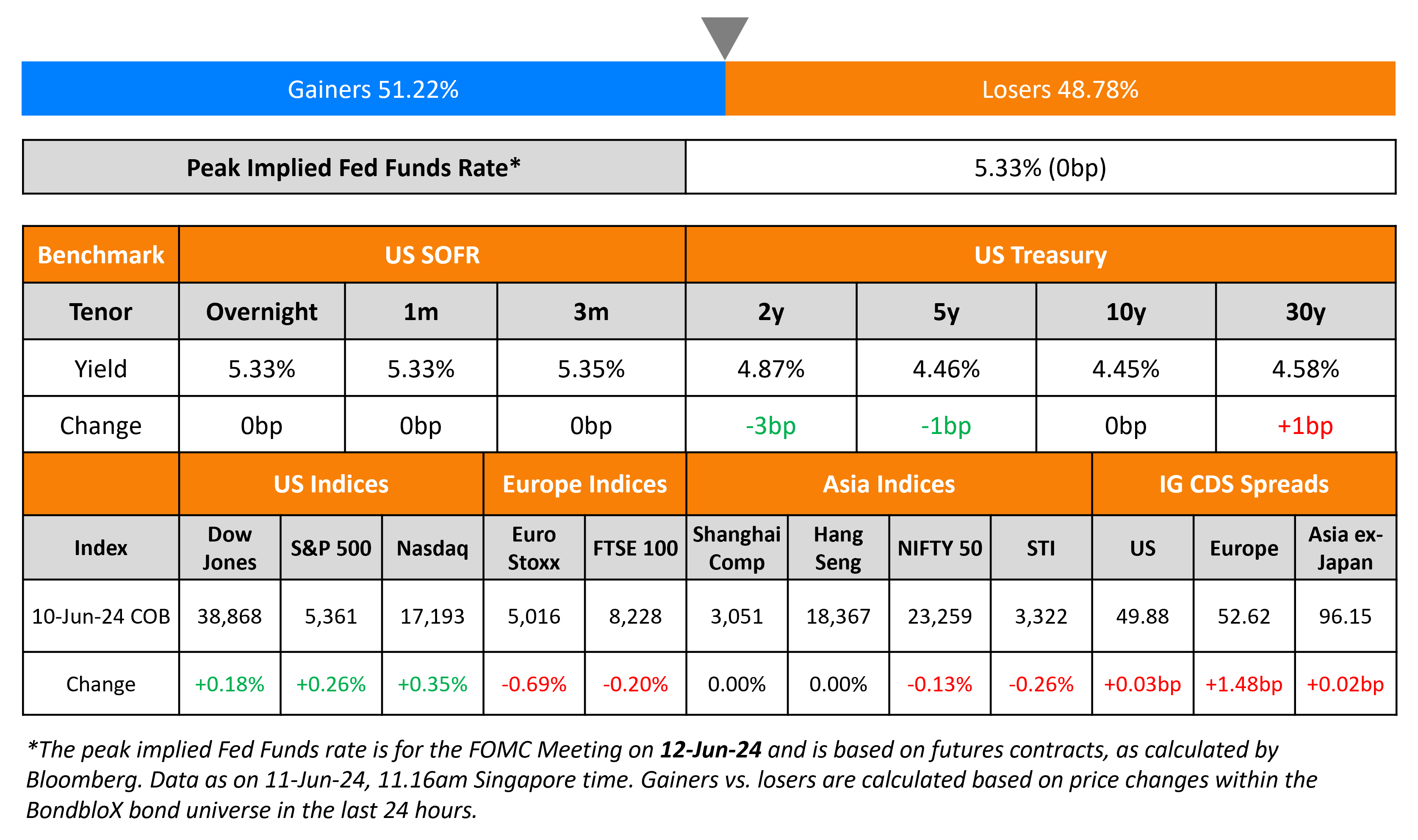US Treasury yields were muted to begin the week, with markets awaiting the inflation report and the Federal Reserve’s meeting on Wednesday. Primary markets were also muted, ahead of the key data and policy meeting. US equity markets ended higher by 0.3-0.4%. US IG and HY CDS spreads remained flat.