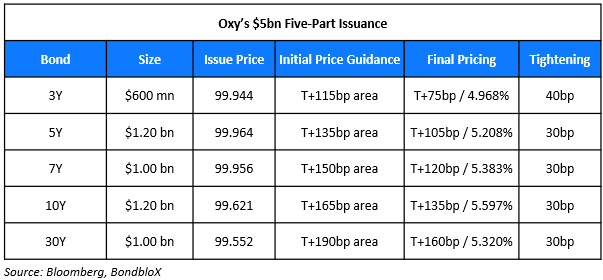 Occidental raised $5bn via a five-part issuance. Details are in the table above. The senior unsecured notes are rated Baa3/BB+/BBB-. Proceeds will be used to finance the cash consideration of the CrownRock acquisition and related financing transactions, fees and expenses. The new 3Y bonds are priced 5bp tighter to its existing 8.5% 2027s that yield 5.02%. The new 5Y bonds are priced 13bp tighter to its existing 3.5% 2029s that yield 5.34%. The new 7Y bonds are priced 4bp tighter to its existing 7.5% 2031s that yield 5.42%.