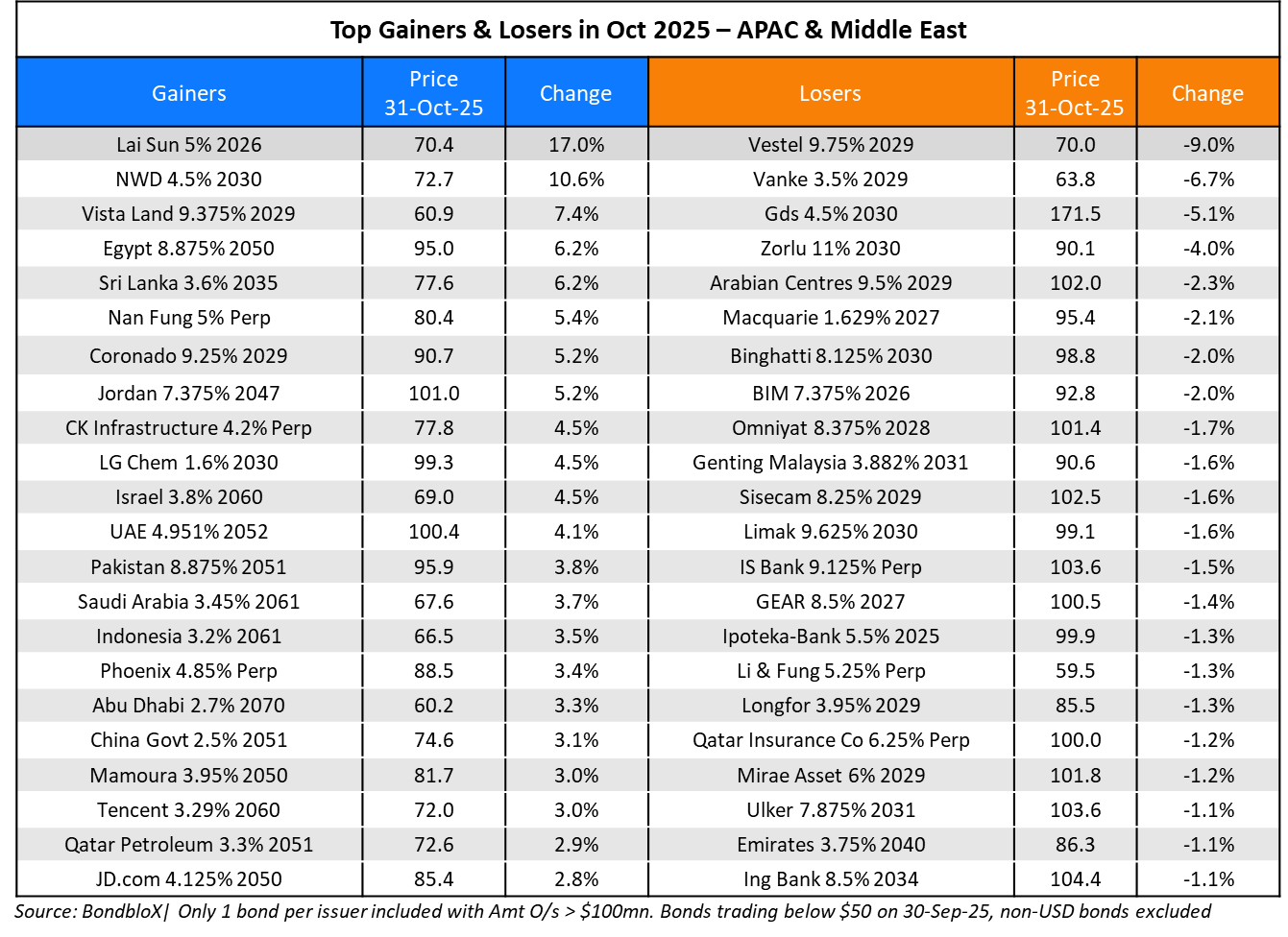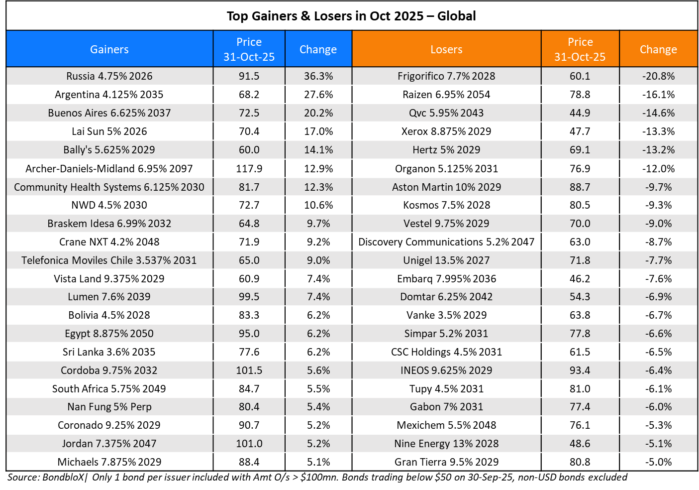In the IG space, Israel’s sovereign bonds were among the top gainers, returning 3-4% during the month on the back of ceasefire agreement in Gaza. Romania’s dollar bonds also rallied about 3% across the curve. Among the top losers, Raizen’s bonds fell sharply by 13-16% due to increased leverage concerns and subsequent downgrade by Fitch. Oracle’s bonds also fell by 2-3% due to heavy investments in AI financed through significant borrowing, leading to a rise in CDS spreads.