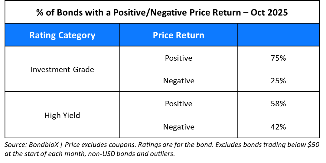 October 2025 was a solid month for bond investors, with 71% of dollar bonds ending higher (price returns ex-coupons). 75% of Investment Grade (IG) bonds ended in the green, outperforming High Yield (HY) bonds where 58% ended in the green. US Treasury yields dipped during the beginning of the month due to soft PMI data, alongside the US government shutdown. However, following a hawkish FOMC meeting late in the month, Treasury yields rebounded and recovered most of the move, thus weighing on bonds.