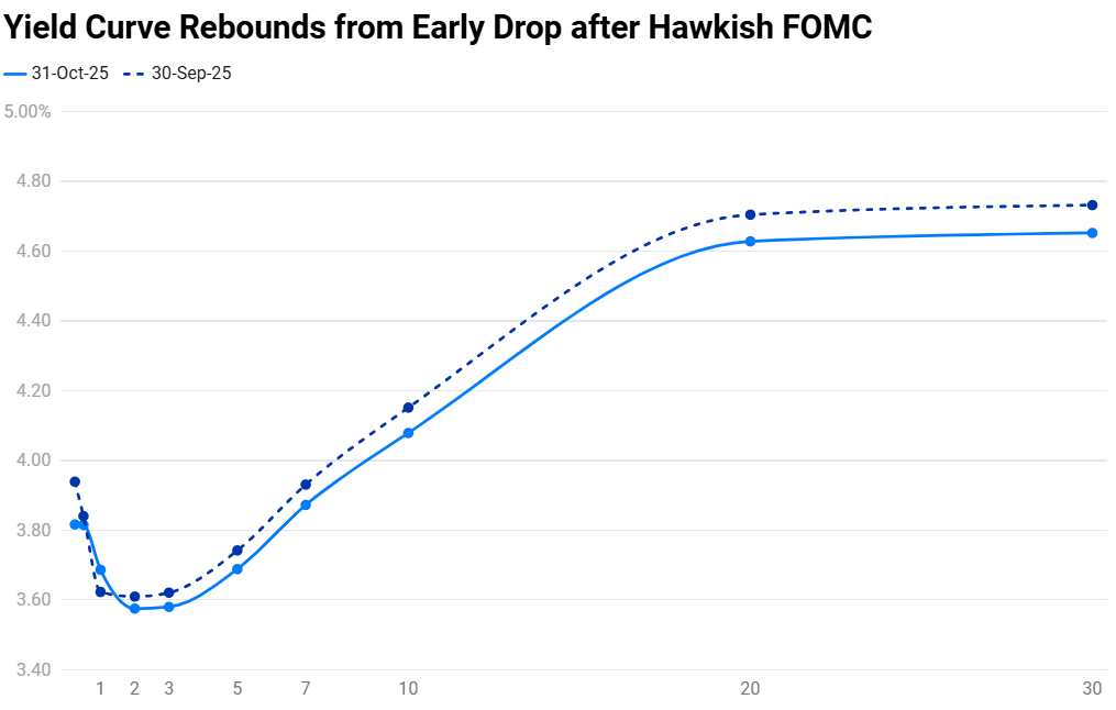The month of October saw the Treasury yield curve shift marginaly lower from September — the 2Y yield fell by 3bp while the 10Y ended 8bp lower. Due to the US government shutdown, the much awaited jobs report comprising of the NFP, Unemployment Rate and AHE was not published. The ISM Manufacturing PMI contracted for a seventh straight month, coming in at 49.1 vs. expectations of 49.0, underscoring the weakness in the sector. ISM Services PMI for September came in at 50.0, softer than expectations of 51.7 and roughly similar to the prior month’s poor 50.0 reading. The inflation readings were delayed and came in late during the month. The Headline and Core CPI reading showed a moderation in inflation. US CPI YoY rose by 3.0%, softer than expectations of 3.1%. Core CPI came in at 3.0%, lower than expectations and the prior month’s print. The broad softness in the data saw markets expect a 25bp Fed rate cut in both of its October and December meetings. However, while the Fed cut rates by 25bp during the month, Chairman Jerome Powell hinted that a 25bp rate cut in their December meeting was “far from” a foregone conclusion. The probability of a 25bp rate cut for December has fallen from nearly 100% prior to the recently concluded FOMC meeting to about 65% presently.