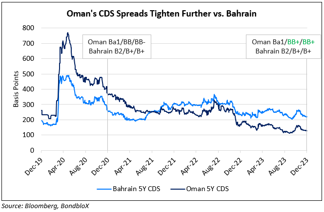 As seen in the chart above, Oman’s 5Y CDS spreads were trading at 262bp, about 66bp wider to Bahrain’s 196bp pre-pandemic, in December 2019. This only worsened further during the height of the pandemic where Oman’s CDS spreads were trading 280bp wider than Bahrain. Ever since, its credit spreads have compressed significantly and currently, Oman’s 5Y CDS spreads trade tighter at 128bp vs. Bahrain’s 220bp. Since 2019, Oman’s credit rating has seen a one/two notch upgrade from S&P/Fitch to BB+/BB+. Over the same period however, Bahrain’s ratings have remained unchanged at B+/B+.