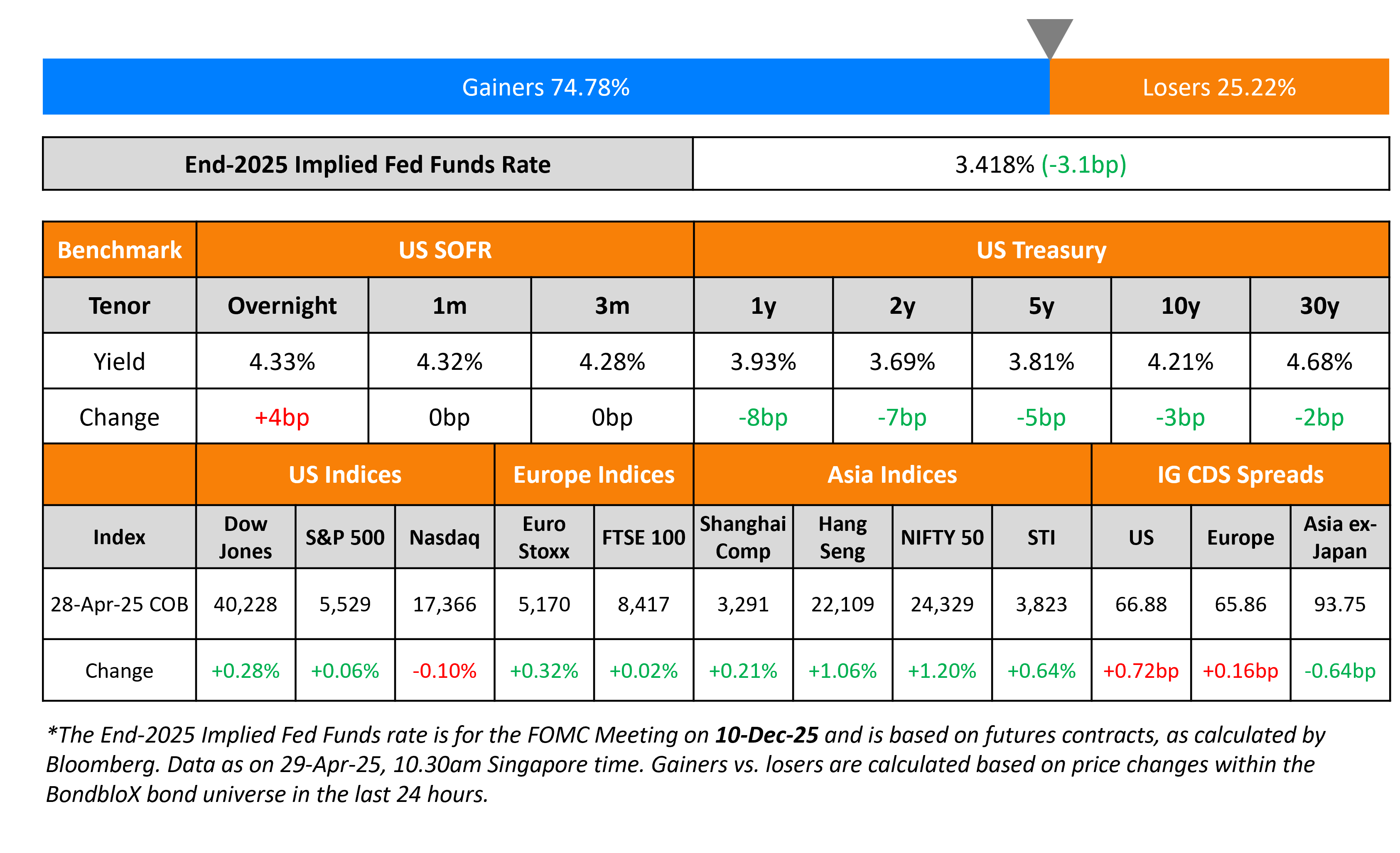 US Treasury yields continued to ease, with the curve steepening yesterday. The 2Y yield fell by 7bp while the 10Y yield was lower by 3bp. The Dallas Fed Manufacturing Activity Index reading for April dropped sharply to -35.8 vs. expectations of -14.1 and the prior month’s -16.3, its lowest level since May 2020.