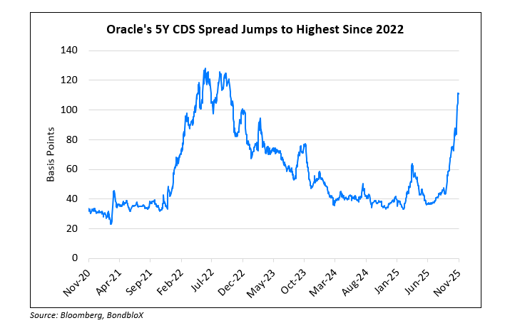 Credit Default Swap (CDS) spreads on Oracle’s 5Y debt have more than doubled over the last two months, from 43bp to its current levels of over 110bp, looking at data from Bloomberg (chart below). This comes on the back of its large AI-related spending and debt financing, whilst being rated (Baa2/BBB/BBB) lower than its peers like Microsoft, Broadcom, IBM etc. Oracle is said to have an order backlog of $455bn. OpenAI recently confirmed it had struck a $300bn deal with Oracle to build out data centers in the US. Oracle, in turn, is spending about $40bn on Nvidia chips for those facilities. Oracle’s capital expenditures are projected to exceed $60bn by fiscal 2028 (as per S&P), and some believe that it may consume all operating cash flows for at least three years. Some analysts have raised concerns that Oracle will not make meaningful profits from such large investments. Separately, its cloud business had seen narrower margins than estimated. In September, Oracle raised $18bn via a six-tranche issuance, the third largest deal this year. Its overall debt-to-equity ratio stands at nearly 4.5x, much higher than its peers. While analysts note that Oracle is not expected to default soon, the surge in CDS activity might reflect a position by traders/speculators to generate profits on the back of a potential broader drop in the AI sector.