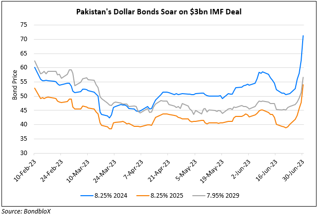 Pakistan’s dollar bonds soared over 10% after the nation reached a staff-level agreement with the IMF on a $3bn standby arrangement which will be spread out over 9 months. The magnitude of the funding is higher than expected, as the country was said to be in discussions with the IMF for a $2.5bn standby facility. This comes after its $6.5bn Extended Fund Facility (EFF) programme by the IMF was stalled for eight months and expired on Friday. The deal brings good news to Pakistan as the country is struggling against a backdrop of a shortage of foreign currency reserves, which were barely enough to cover one month’s imports. However, the agreement is still subject to approval by the IMF board in July. Last week, Pakistan’s parliament approved a revised budget after the IMF criticized its initial budget earlier. The latest review of Pakistan’s EFF is IMF’s ninth review and came just in time before its Friday deal expiration.