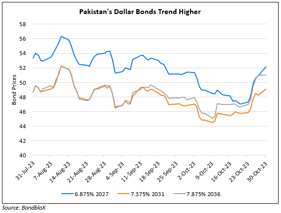 Pakistan’s dollar bonds were amongst the top gainers last week, rallying over 8-10% across the curve. Pakistan made a timely coupon payment on its 8.25% 2024s as per brokerage firm Topline Securities. Also, the nation will be in talks with the IMF this week to unlock $710mn as part of the second tranche of the multilateral lender’s $3bn bailout loan. As part of the nine-month bailout package, the IMF had initially transferred $1.2bn to Pakistan in July. The country’s financial position has seen an improvement with its forex reserves improving from just $3.1bn in January to $7.6bn at end-September 2023.