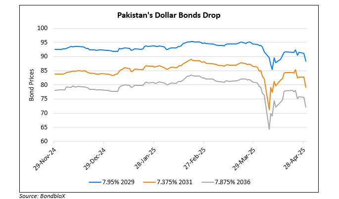 Pakistan’s dollar bonds fell sharply across the curve after escalations rose with India, following the recent terrorist attacks on tourists in Kashmir. India has released a set of measures including the abeyance of the Indus Waters Treaty, suspension of visas and the sending back of diplomats. Pakistan has paused all bilateral agreements and suspended all trade with India, including to and from any third country and closed its airspace to all Indian-owned and Indian-operated airlines.