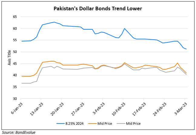 Pakistan’s dollar bonds were lower by 1.5 points across the curve to trade at 40 cents on the dollar. As per Bloomberg, its dollar bondholders are bracing for a potential default with the nation having ~$7bn in debt repayments by June, that includes a $2bn Chinese loan due in March. Earlier this week, the sovereign was downgraded to Caa3 from Caa1 by Moody’s. Pakistan is in talks with the IMF and hoping for the latter to resume its bailout loan instalment. In early February, IMF team said it held positive talks but stopped short of unlocking its $1.1bn bailout deal. IMF requires Pakistan to show a strengthening in its fiscal position with permanent revenue measures and reduction in untargeted subsidies.