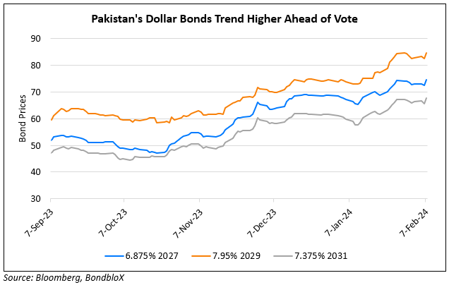 Pakistan’s dollar bonds rallied by over 2 points across the curve after S&P said that it saw the nation being on a path to secure a possible upgrade to B. It said that the move would depend on whether the elections today will bring about a government that can push for tough reforms. S&P analysts said that a government with popular support which can work with key institutions will have a greater chance of securing financing from the IMF. S&P currently rates Pakistan at CCC+, a notch below B. The nation received a $3bn IMF bailout which is set to end in March and thus, the election comes at a crucial time.