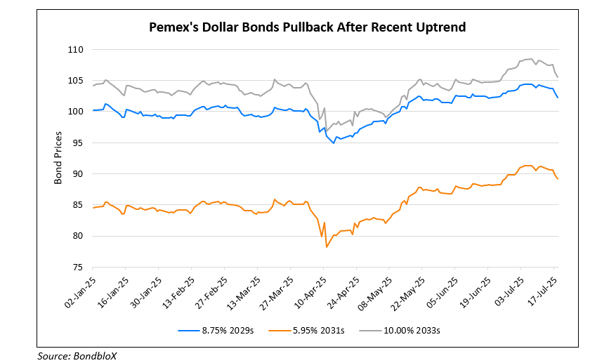 Pemex’s dollar bonds which were on an uptrend since mid-April, rallying by ~10% are trading weaker over the last two days. The Energy Workforce & Technology Council (EWTC), a Houston-based national trade association for energy service companies, requested Mexican President Claudia Sheinbaum to address non-payments by Pemex. In a letter, the EWTC warned that continued delays in payment are threatening future investment in Mexico’s energy sector. Pemex owes the EWTC’s members $871mn for services rendered in 2024 and $983mn for work completed in 2025