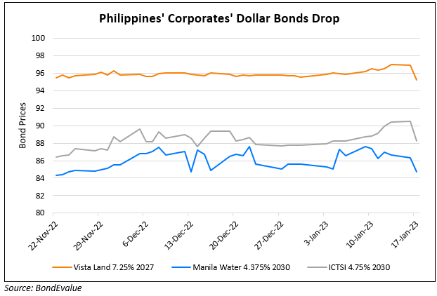 Dollar bonds of Philippines corporates like SMC Global, ICTSI, Manila Water, Vista Land etc. traded lower by over 2 points on Monday, as seen in the chart above. The reason for the move was not clear.