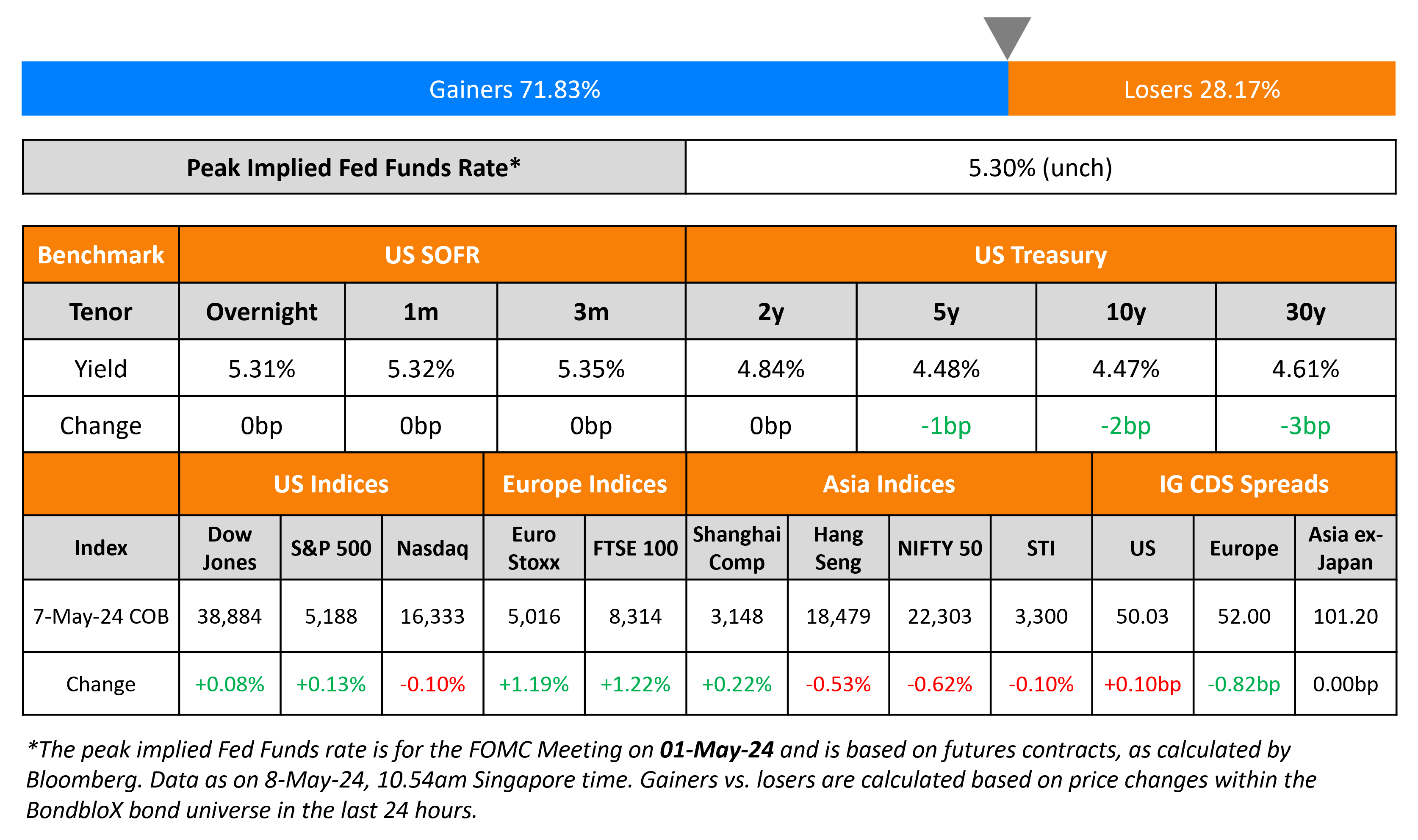US Treasuries were stable on Tuesday with no economic data releases. Minneapolis Fed President Neel Kashkari said that the Fed will likely keep interest rates restrictive for “an extended period of time”. He added that there may be a reduction in rates if inflation decreases or if they see a “marked weakening in the labor market”. He further said, “if we get convinced eventually that inflation is embedded or entrenched now at 3% and that we need to go higher, we would do that if we needed to”. S&P and Nasdaq were nearly unchanged. US IG CDS spreads widened 0.1bp and HY spreads were 1bp tighter.