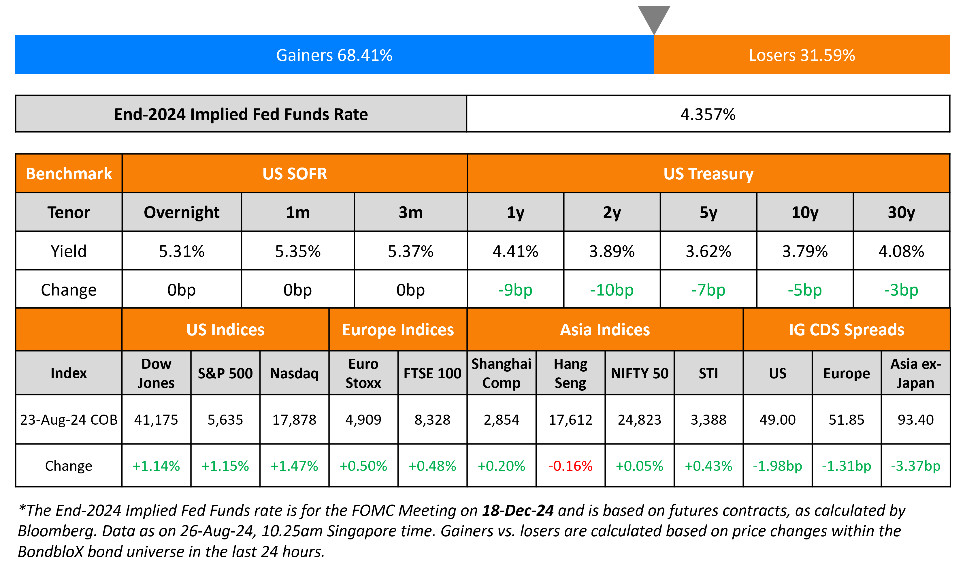 US Treasury yields dipped across the curve, led by the 2Y yield down by 10bp while the 10Y yield was down 5bp. At the Jackson Hole meeting, Fed Chairman Jerome Powell said that the “time has come for policy to adjust”, adding that the “direction of travel is clear, and the timing and pace of rate cuts will depend on incoming data, the evolving outlook and the balance of risks”. He further noted that current level of the fed funds rate gave them “ample room to respond to any risks”. US IG CDS spreads tightened by 2bp while HY CDS spreads tightened by 13bp. Looking at US equity indices, the S&P and Nasdaq were up by 1.2% and 1.5% respectively.