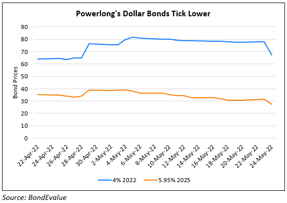 Dollar bonds of Powerlong Real Estate dropped as much as 8-10 points on Tuesday. While the exact reason for the drop is not known, the developer was recently downgraded by Moody’s to Caa1 from B3 due to high refinancing risk and weakened liquidity. Moody’s expects Powerlong to use its internal resources to repay $600mn of maturing debt in 2022, which will further weaken its liquidity.