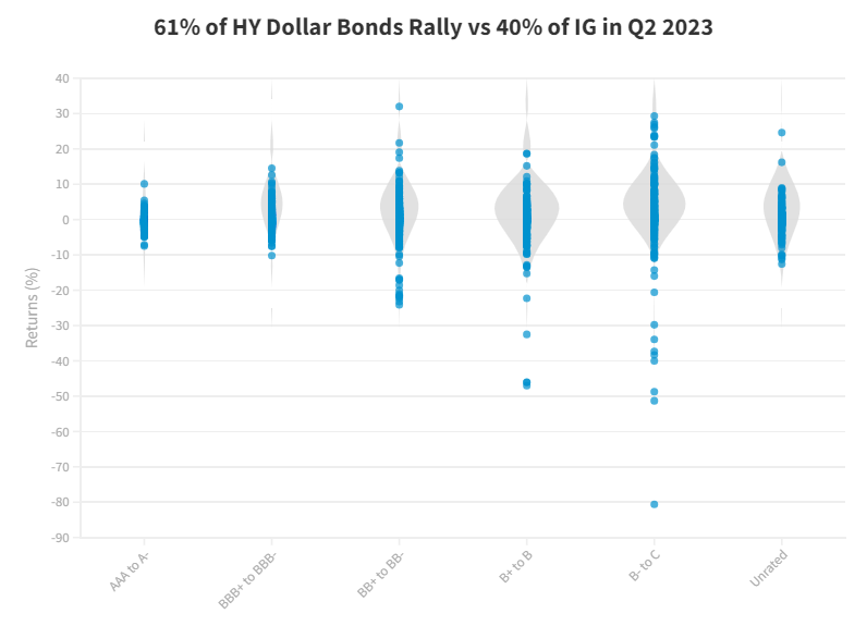Below is a violin chart of returns across the IG and HY spectrum. Hovering over the dots shows specific bonds and their returns across the rating categories.