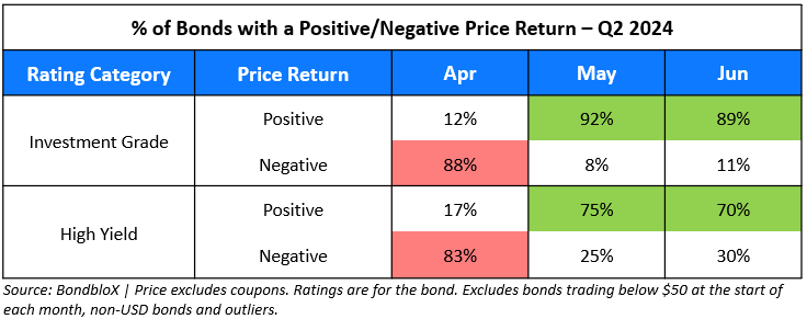 Q2 2024 was a relatively modest one with 60% of dollar bonds in our universe delivering a negative price return (ex-coupon). Among this, 54% of high yield (HY) bonds delivered positive returns, outperforming investment grade (IG) bonds where 63% ended in the red. The quarter can we viewed as being predominantly driven by Treasuries, but in two separate parts – the first of which was in April, being a poor month for bonds as markets priced out rate cuts by the Fed amid consistently solid data out of the US. From initially pricing-in over 50bp in rate cuts, markets only priced-in one rate cut during the month. However, as economic data softened in May and further weakened in June, bond investors witnessed positive price returns as seen in the table above.