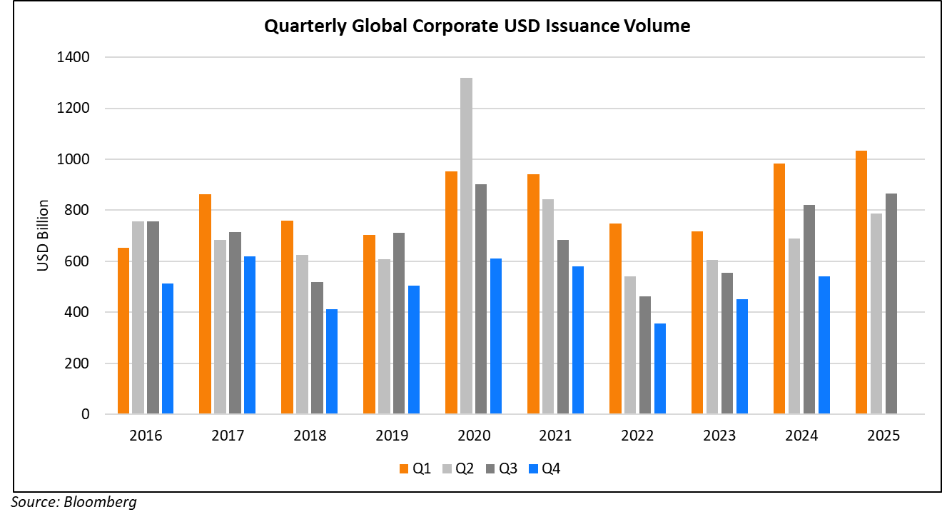 In Q3 2025, global corporate dollar bond issuances stood at nearly $880bn, over 7% higher than the same quarter last year which was at $820bn. In comparison to Q2 2025, issuance volumes were 10% higher. Q3’s issuances were also the highest during the second quarter of a year in a decade, led by a deluge of new deals in September, one of the busiest months on record.