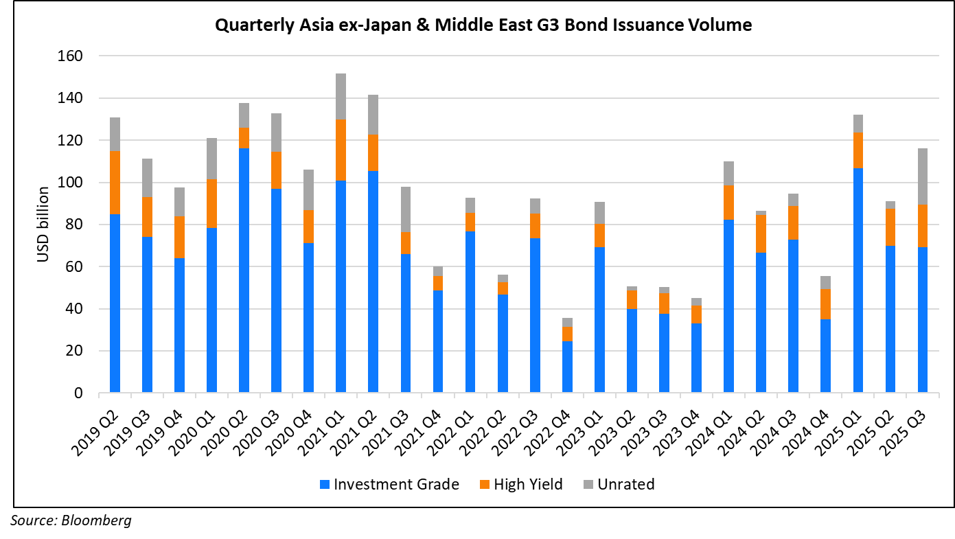 Asia ex-Japan & Middle East G3 issuances in Q3 2025 stood at $130bn, 25% higher YoY, and 30% higher QoQ. 60% of the volumes in the recently concluded quarter came from IG issuers while HY contributed to about 20% of deal volumes, with the remainder taken up by unrated issuers.