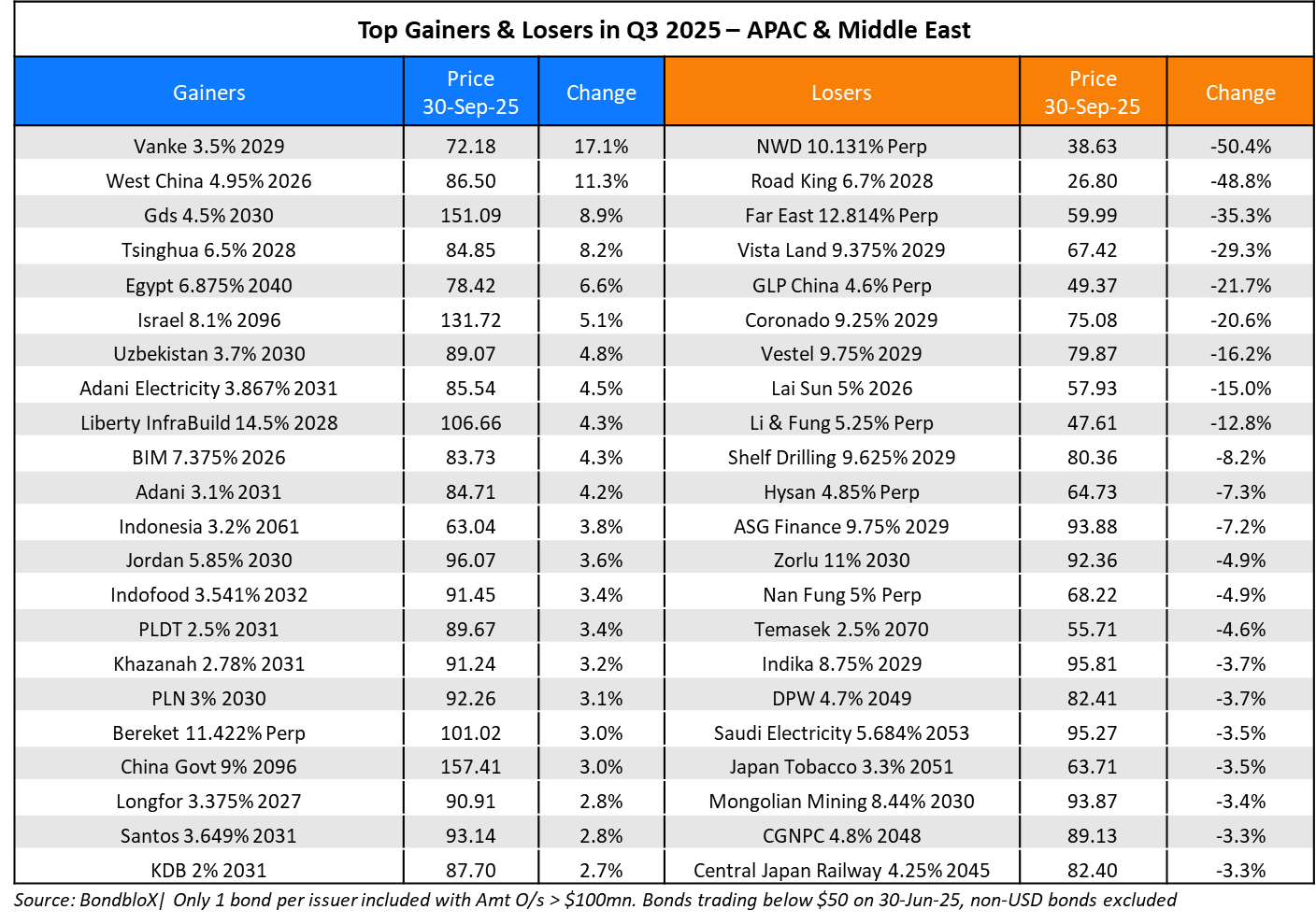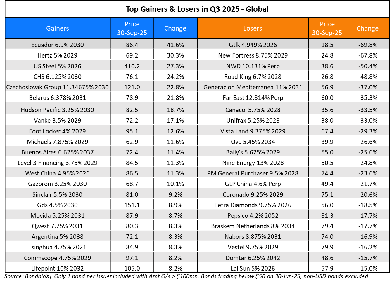 Ambipar’s dollar bonds were the top losers in the category, plunging by ~80%, after concerns emerged over the company’s potential business and debt restructuring. Braskem’s dollar bonds lost almost half of their value during the quarter, after downgrades by multiple rating agencies on the back of weak financials and restructuring concerns. Argentina’s bonds fell by 17-20% after President Milei’s party lost the provincial elections of Buenos Aires and weak economic data. Xerox’s bonds fell by ~12-20% after reporting weak 2Q25 results and a downgrade by S&P.