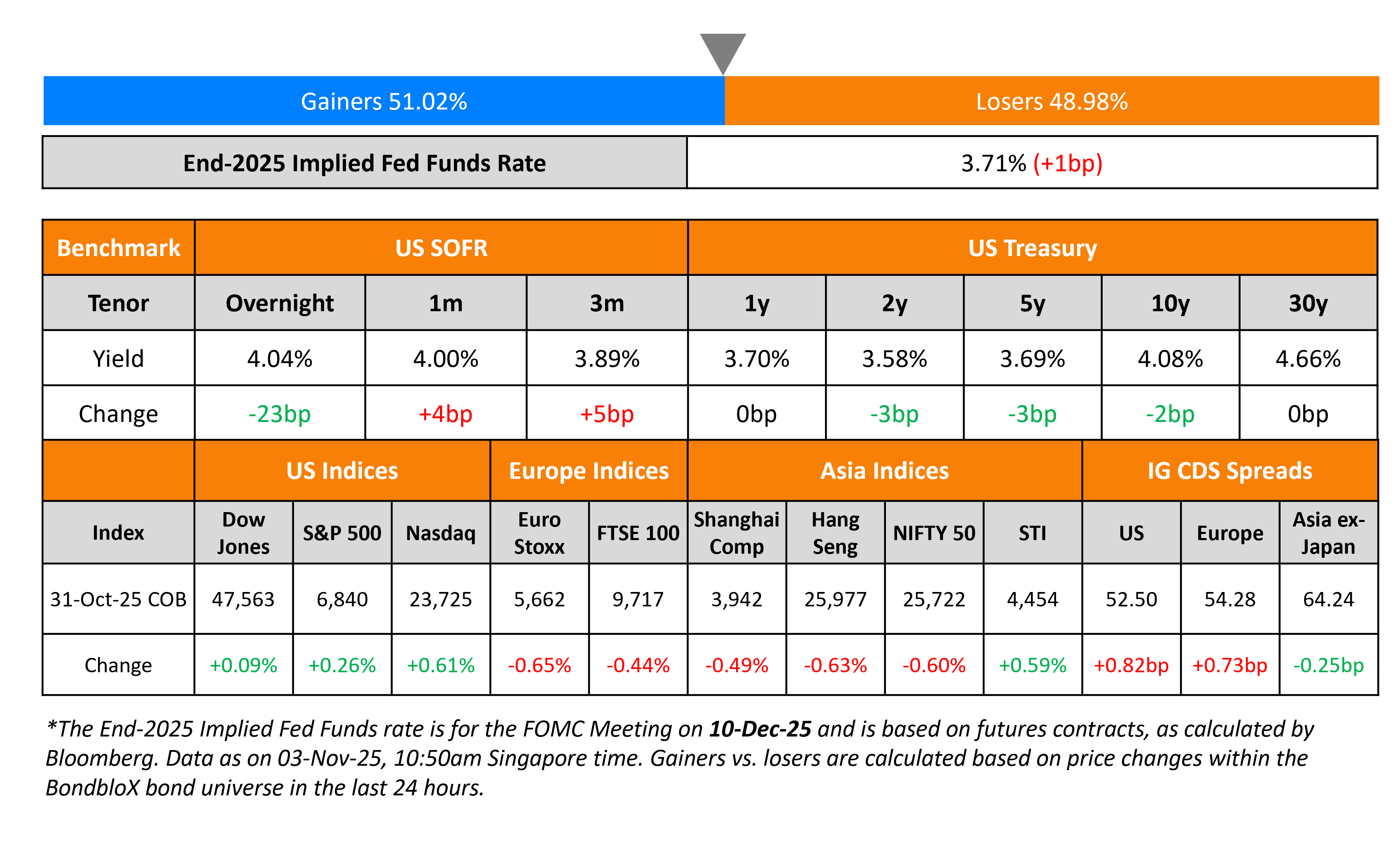 Looking at equity markets, the S&P and Nasdaq ended higher by 0.3% and 0.6%. The US IG and HY CDS spreads widened by 0.8bp and 2.3bp respectively. European equity indices ended lower. The iTraxx Main CDS spreads were 0.7bp wider while the Crossover CDS spreads were 3.5bp wider. Asian equity markets have opened higher today. Asia ex-Japan CDS spreads were 0.3bp tighter. China’s Manufacturing PMI in October fell to 49.0 vs. expectations of 49.6 and the prior month’s 49.8 print. The was its seventh consecutive contractionary reading (below 50.0). The Non-Manufacturing PMI came-in at 50.1, inline with expectations and slightly higher than the prior month’s 50.0 print.