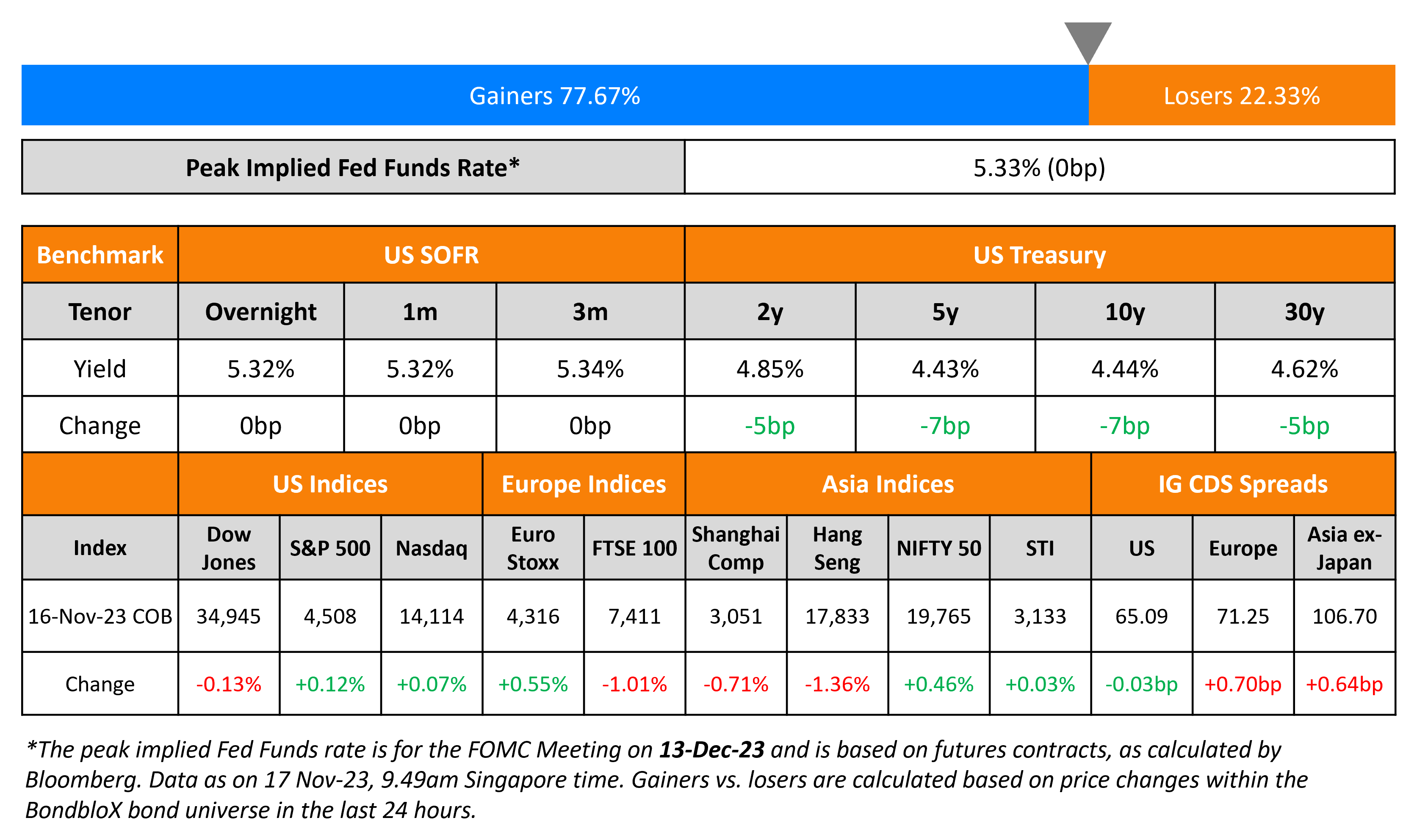 US Treasury yields edged lower yesterday, reversing the pick-up seen a day prior. Yields were down 6-7bp across the curve. Initial jobless claims for the prior week rose by 13k to 231k, higher than forecasts of 220k. The Peak Fed Funds Rate was unchanged. US credit markets saw IG CDS spreads staying flat while HY spreads tightened by 1.4bp. S&P rose and Nasdaq inched higher by 0.1%.